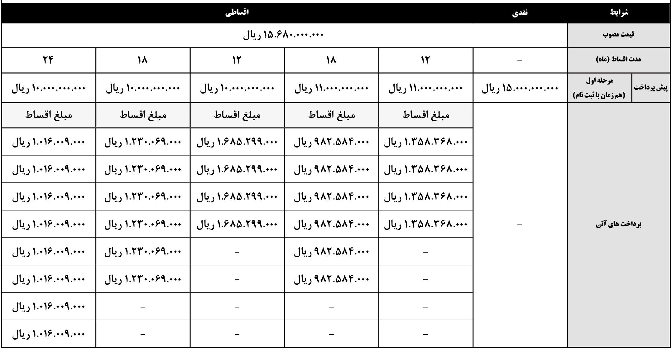 | مراحل پرداخت | یک مرحله | 12 ماهه | 24 ماهه |