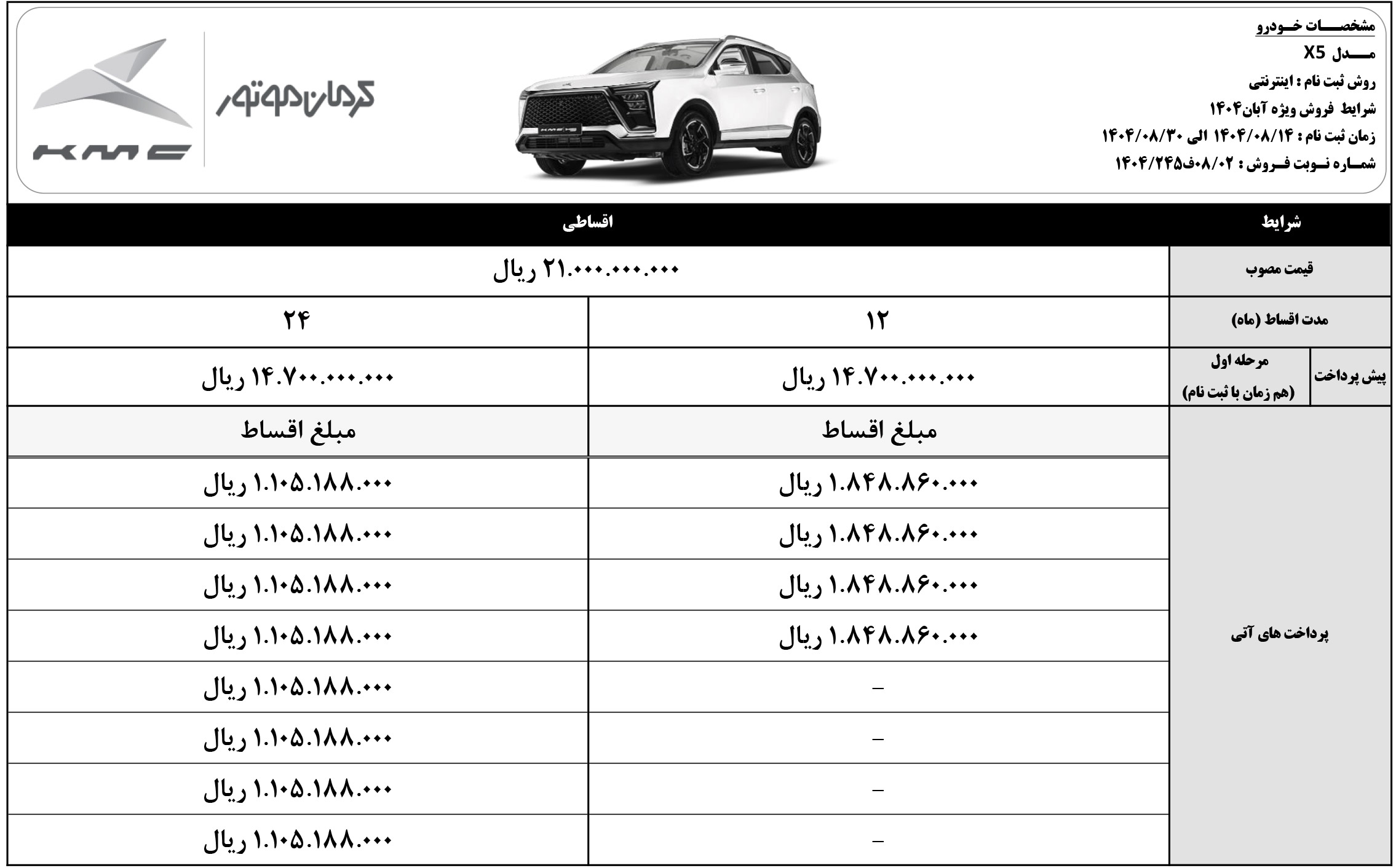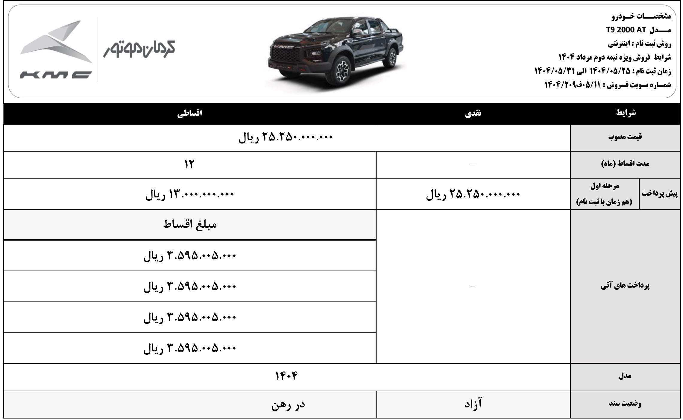 فروش اقساطی کی ام سی: اردیهشت 1404