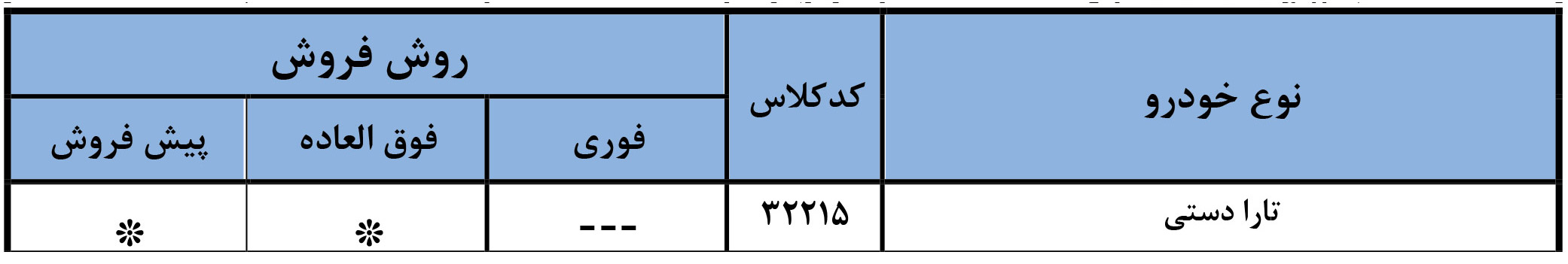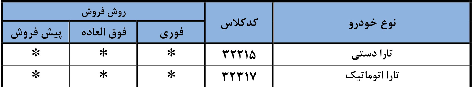 همزمان با اعلام هشتمین مرحله فروش سراسری شرکت ایران خودرو ویژه مهرماه 1404، شرایط فروش انواع محصولات تارا، در مدلهای دندهای و اتوماتیک، نیز از سوی این شرکت اعلام شده است که براساس آن، متقاضیان از روز یکشنبه مورخ 1404/07/06 تا پایان روز پنجشنبه مورخ 1404/07/10 جهت نامنویسی و انتخاب حداکثر یک خودرو (مطابق جدول زیر) مهلت دارند:
