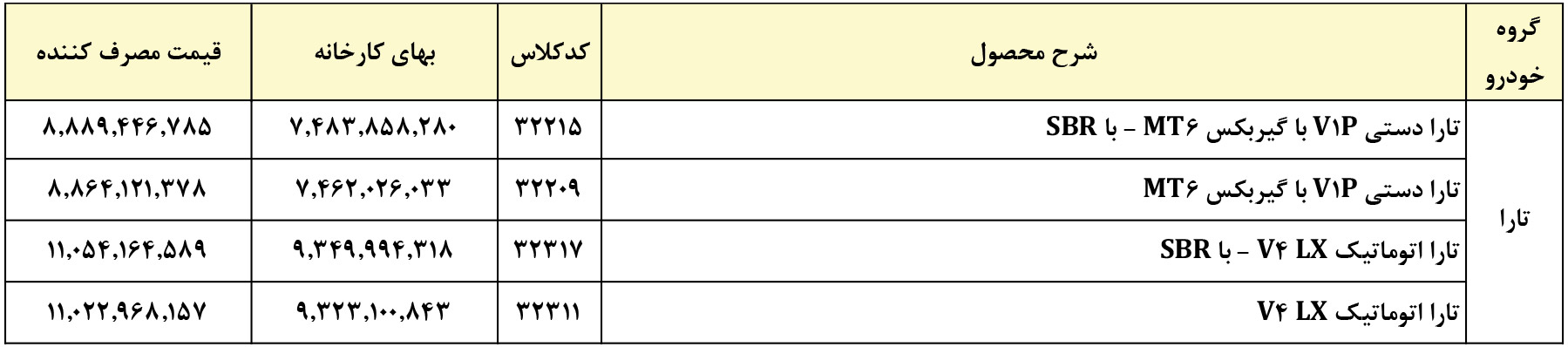 شرکت ایران خودرو قیمت جدید انواع تارا دستی و تارا اتوماتیک را از تاریخ 1404/01/09 مطابق جدول زیر اعلام کرده است: