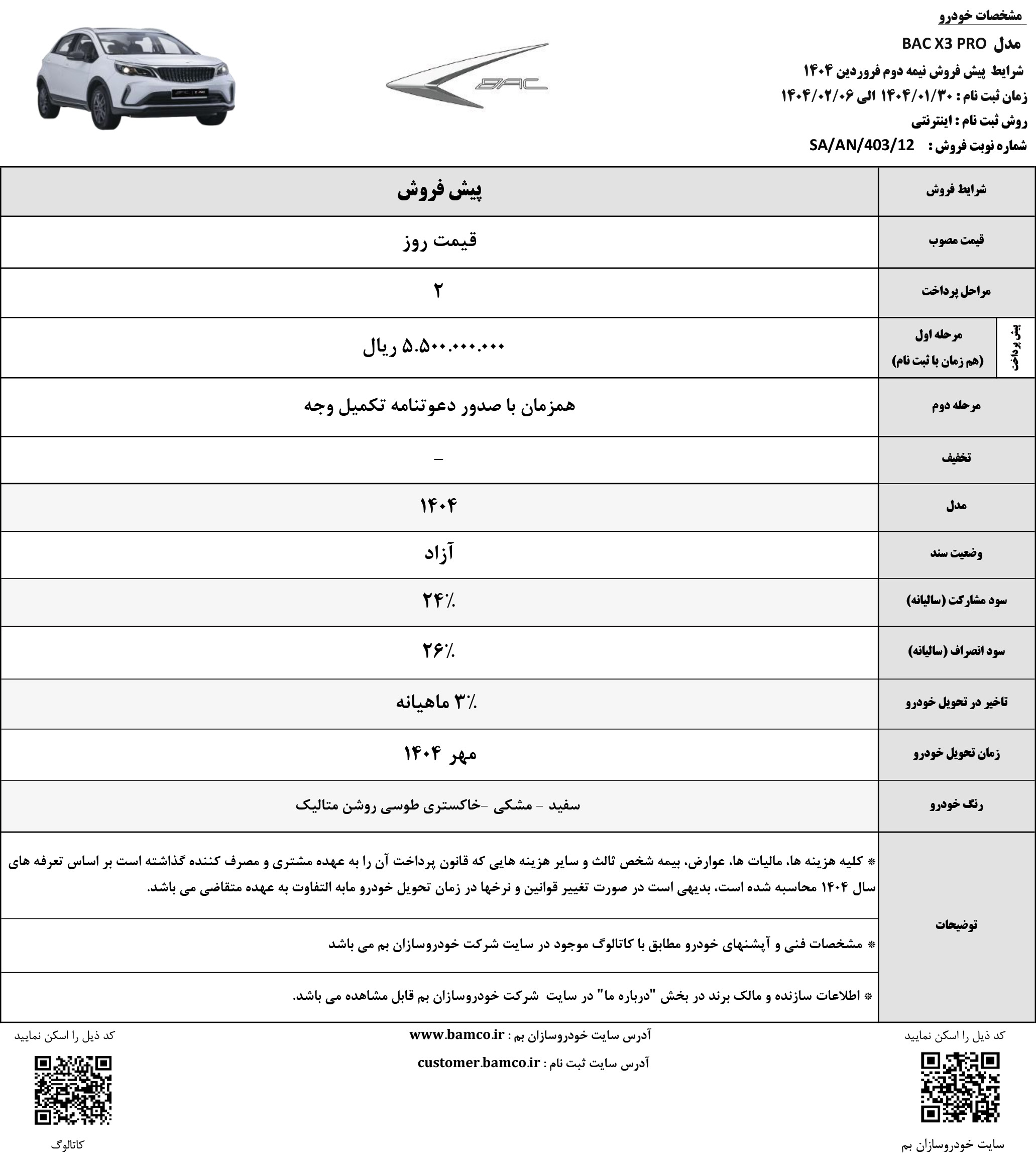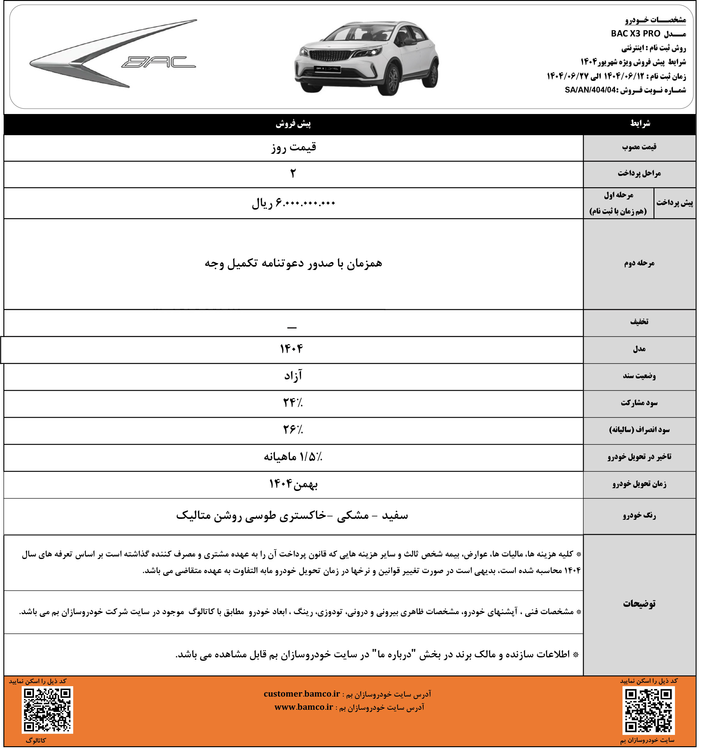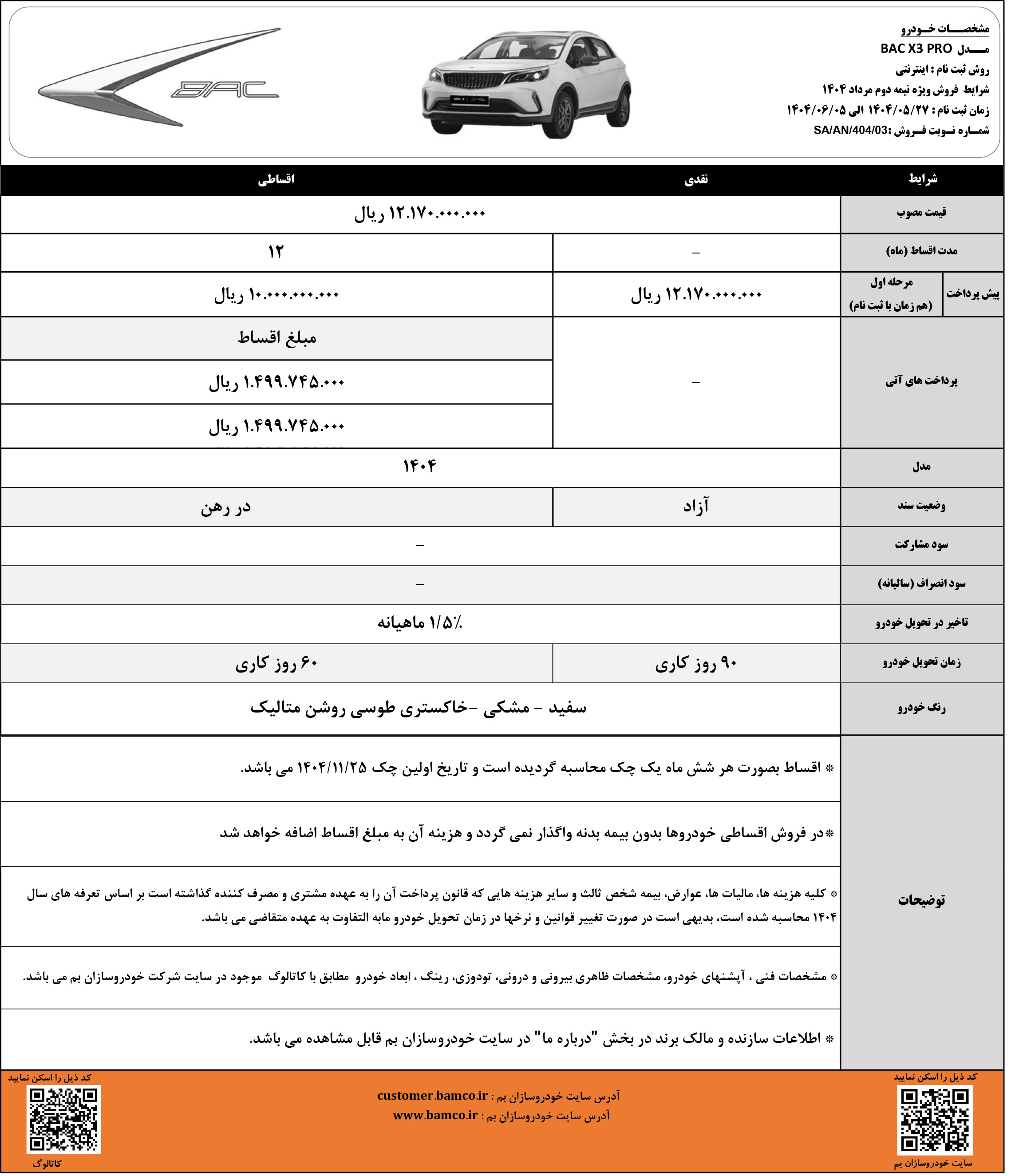 شرایط فروش خودروسازان بم ویژه متقاضیان ثبت نام BAC X3 PRO از روز دوشنبه مورخ 1404/05/27 آغاز شده و تا روز چهارشنبه مورخ 1404/06/05 یا تا زمان تکمیل ظرفیت فروش نیز ادامه خواهد داشت: