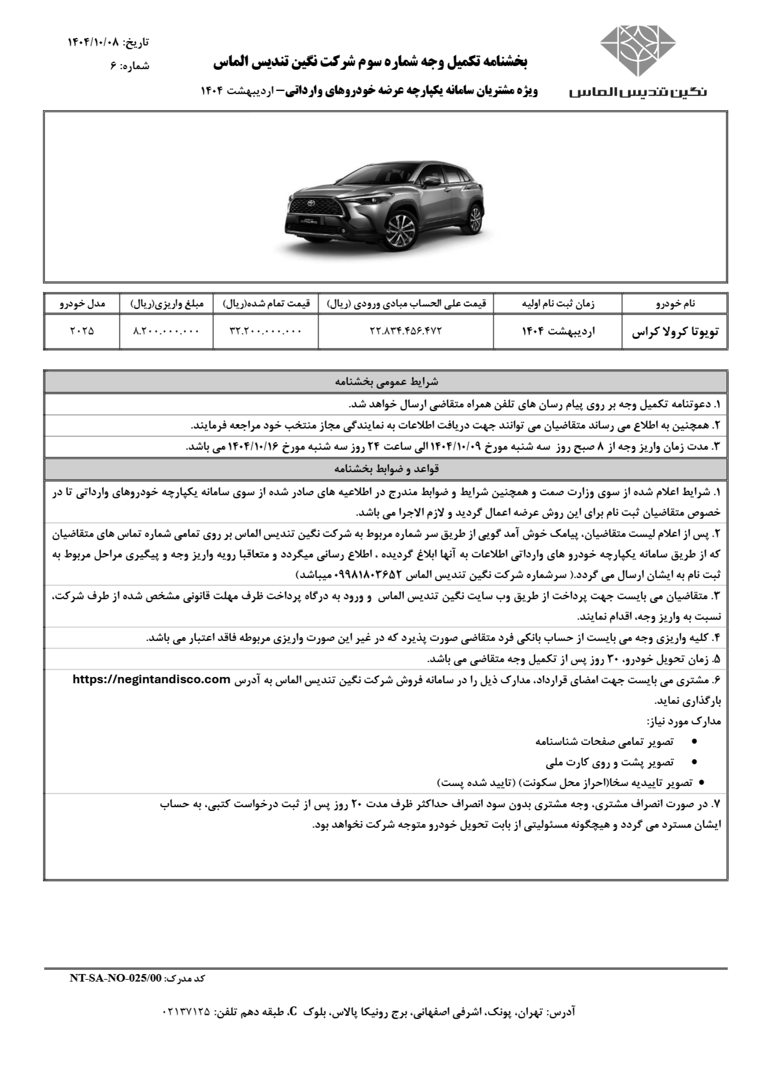 بخشنامه فروش تویوتا کرولا کراس وارداتی (PDF)
