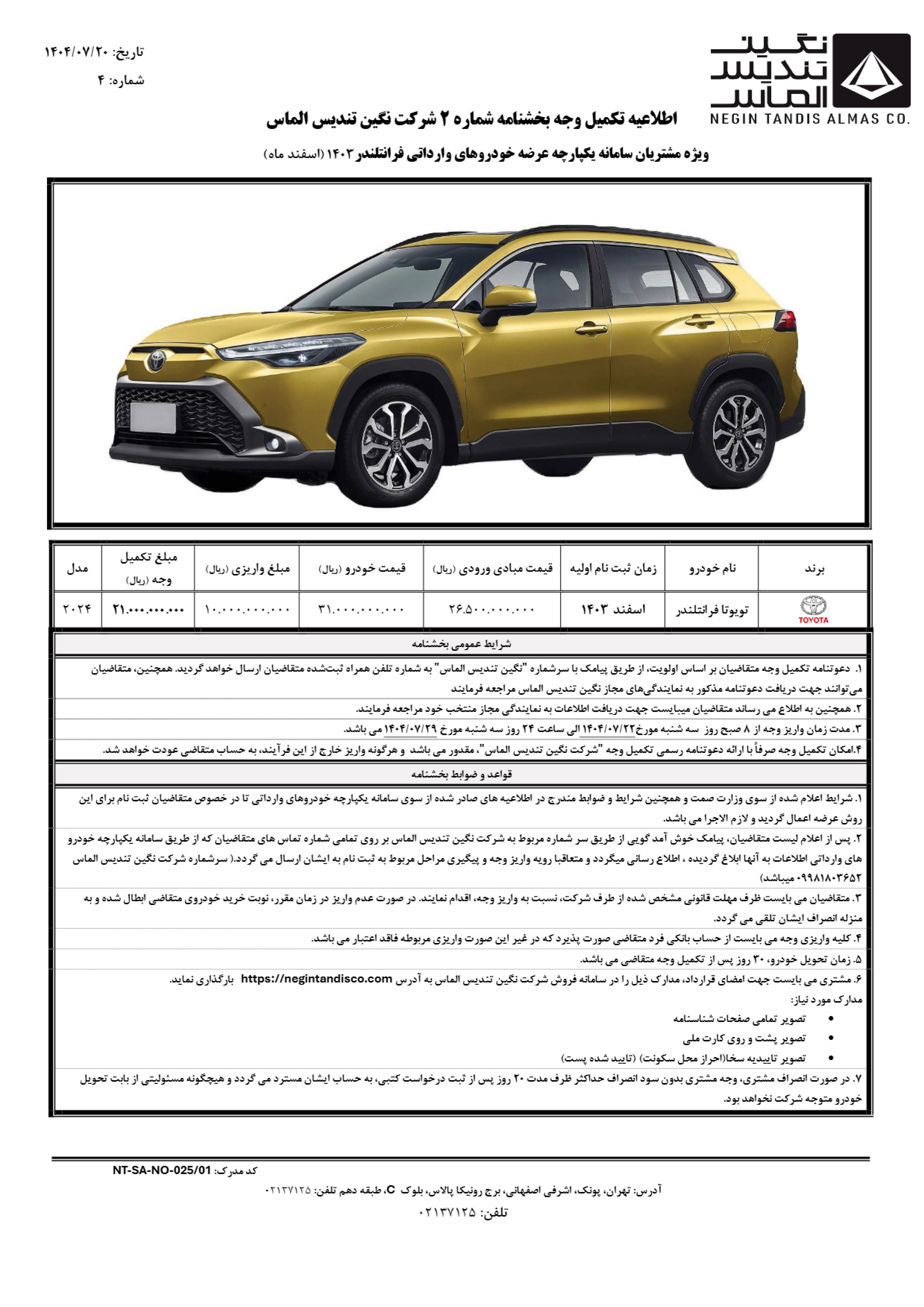 ثبت نام تویوتا فرانتلندر نگین تندیس: مهر 1404