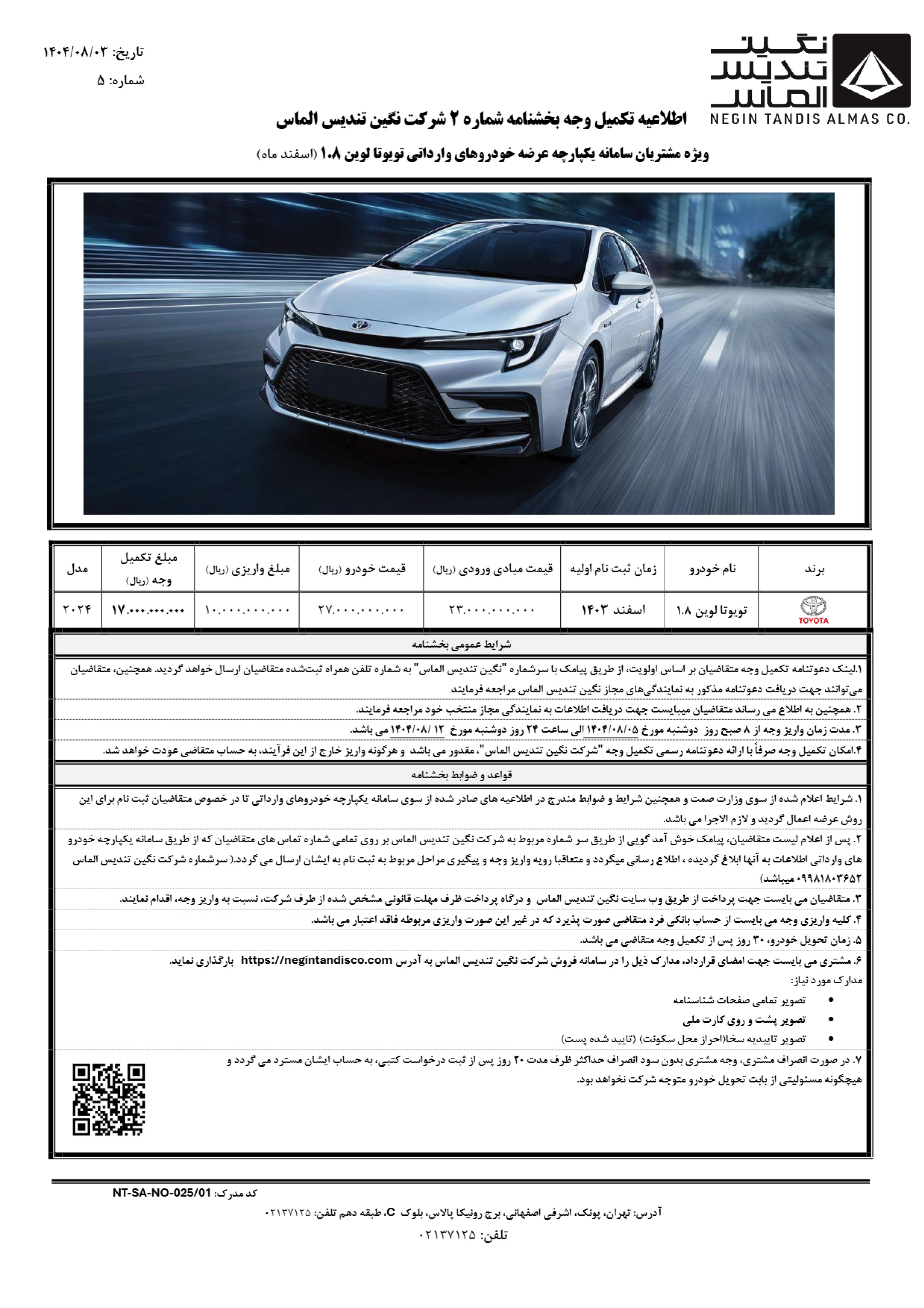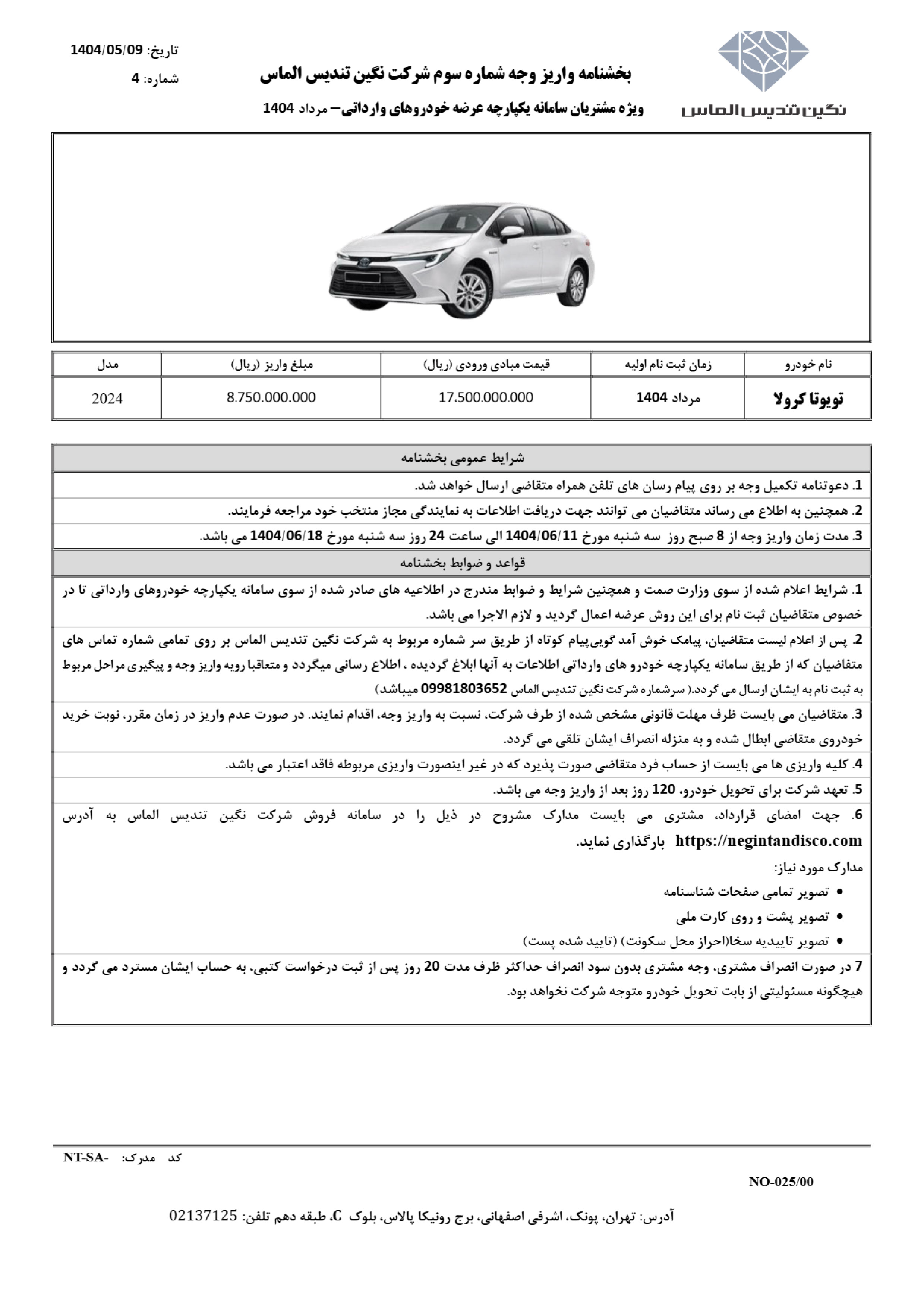 فراخوان فروش نگین تندیس الماس ویژه منتخبین سامانه یکپارچه وارداتی که در مردادماه 1404 برای ثبت نام تویوتا کرولا وارداتی این شرکت، نام‌نویسی کرده‌اند، اعلام شده است. متقاضیان واجد شرایط از روز سه‌شنبه مورخ 1404/06/11 تا پایان روز سه‌شنبه مورخ 1404/06/18 جهت واریز وجه و تکمیل مراحل ثبت نام، فرصت دارند: