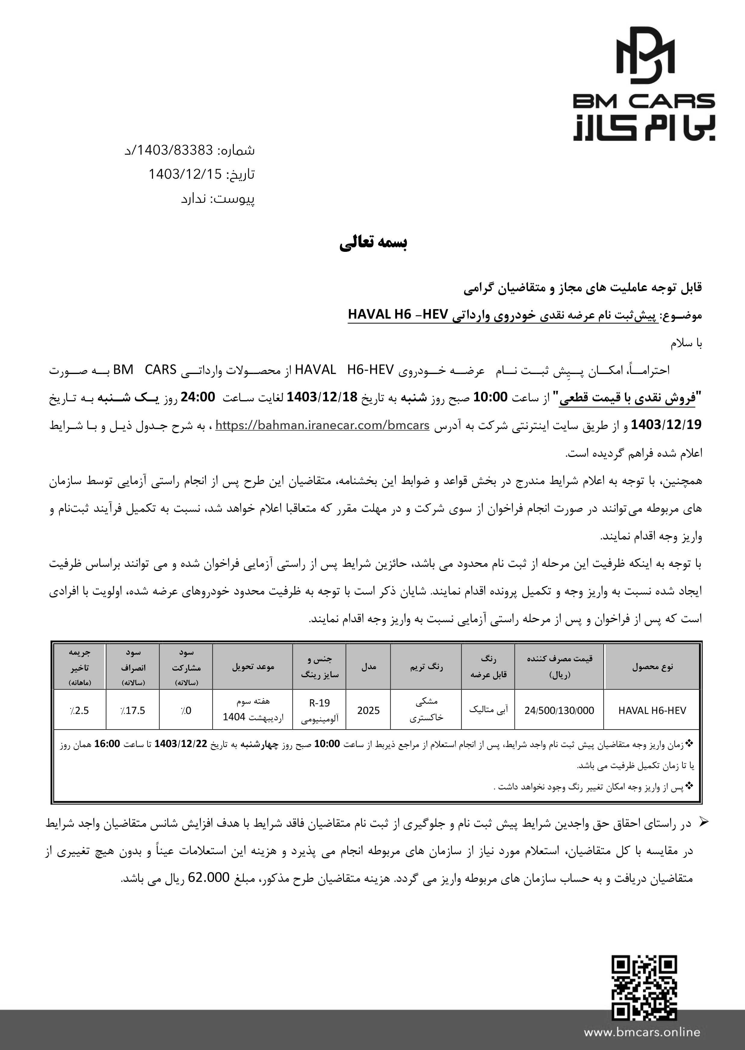 پیش ثبت نام خرید خودروی وارداتی هاوال هیبریدی، از طریق سامانه فروش اینترنتی بهمن موتور، از روز شنبه مورخ 1403/12/18 آغاز شده و تا پایان روز یکشنبه 1403/12/19 نیز ادامه دارد. پس از انجام فرآیند قرعه کشی، برندگان و منتخبین نهایی، باید از ساعت 10 صبح روز چهارشنبه مورخ 1403/12/22 جهت واریز وجه و نهاییکردن ثبت نام خودرو وارداتی هاوال، اقدام نمایند: