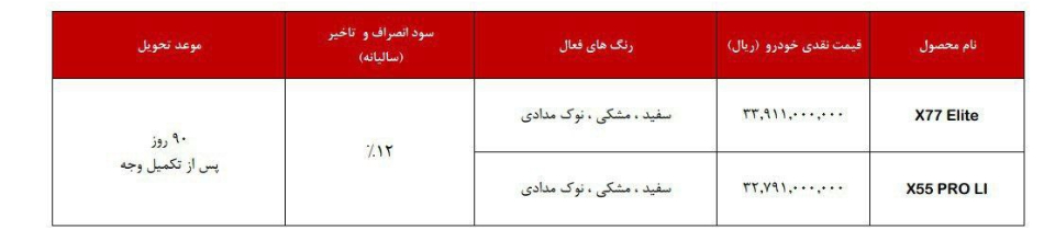 | X33 CROSS CVT | 608,350,000 | سالیانه 35 درصد | سالیانه 20 درصد | 120 روز کاری |