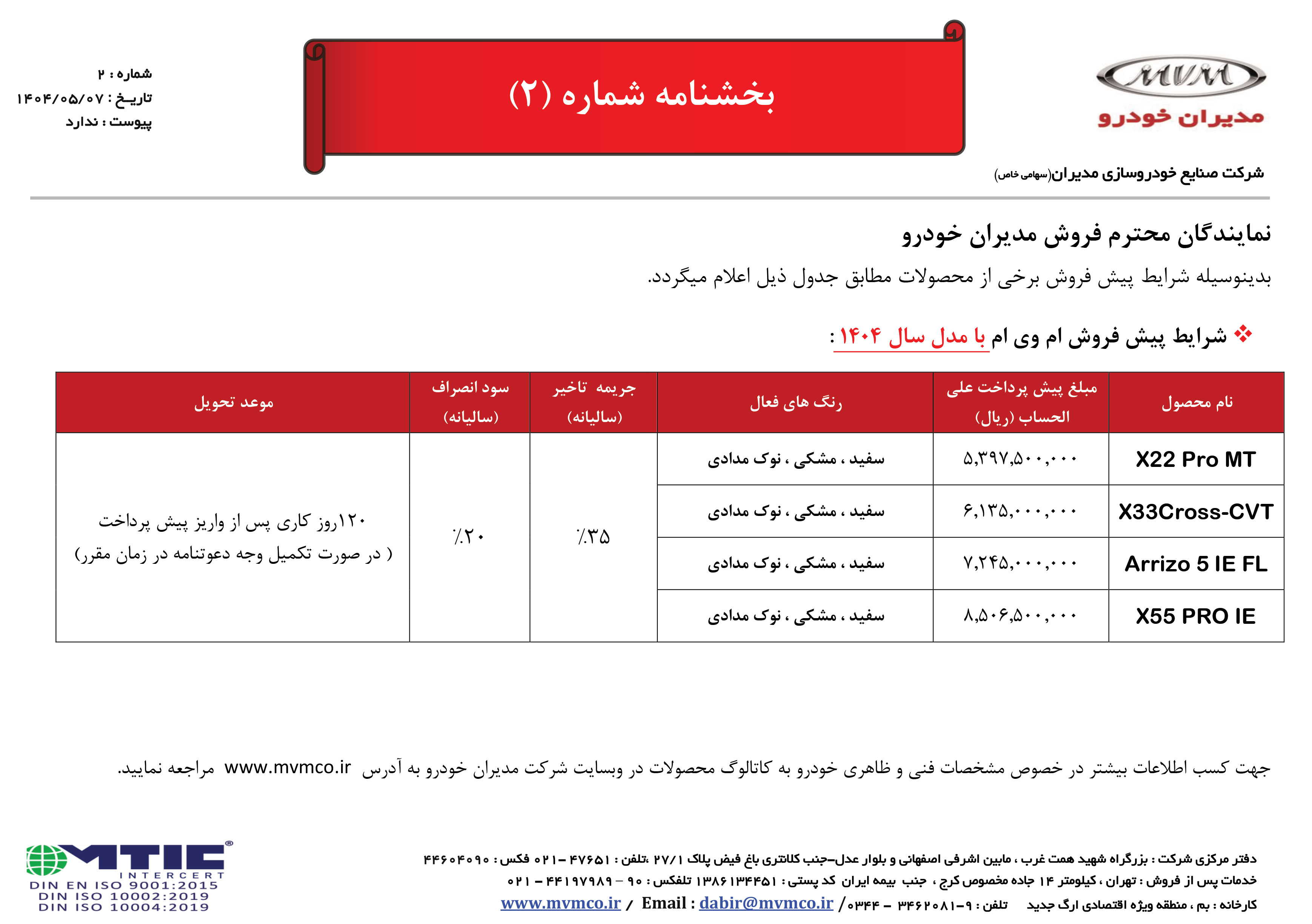 شرایط فروش جدید ام وی ام، ویژه متقاضیان ثبت نام خودروهای X22 و X33 و X55 از ساعت 10 صبح روز شنبه مورخ 1404/04/07 آغاز شده و تا زمان تکمیل ظرفیت فروش نیز ادامه دارد: