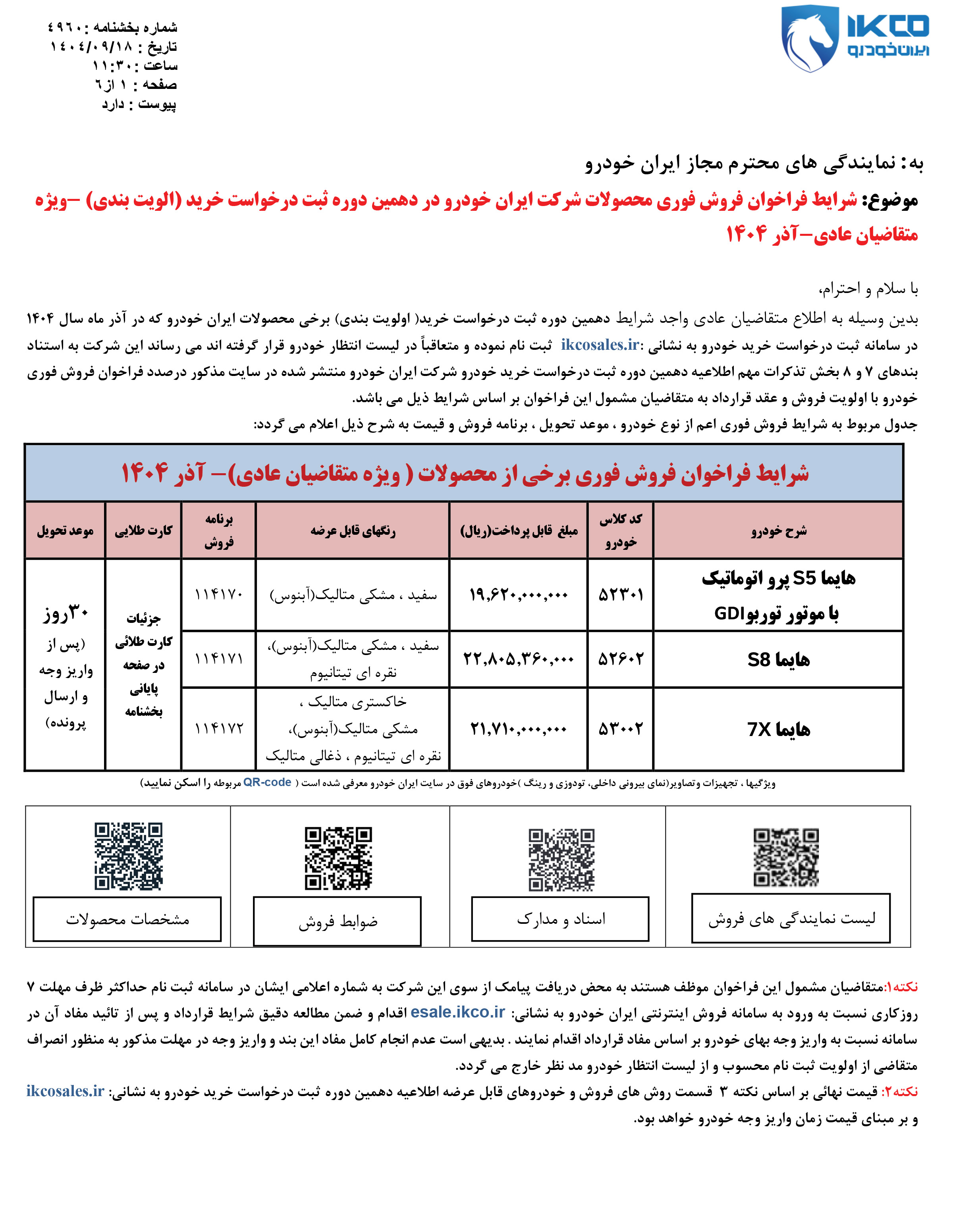 فراخوان فروش فوری هایما ایران خودرو 1404