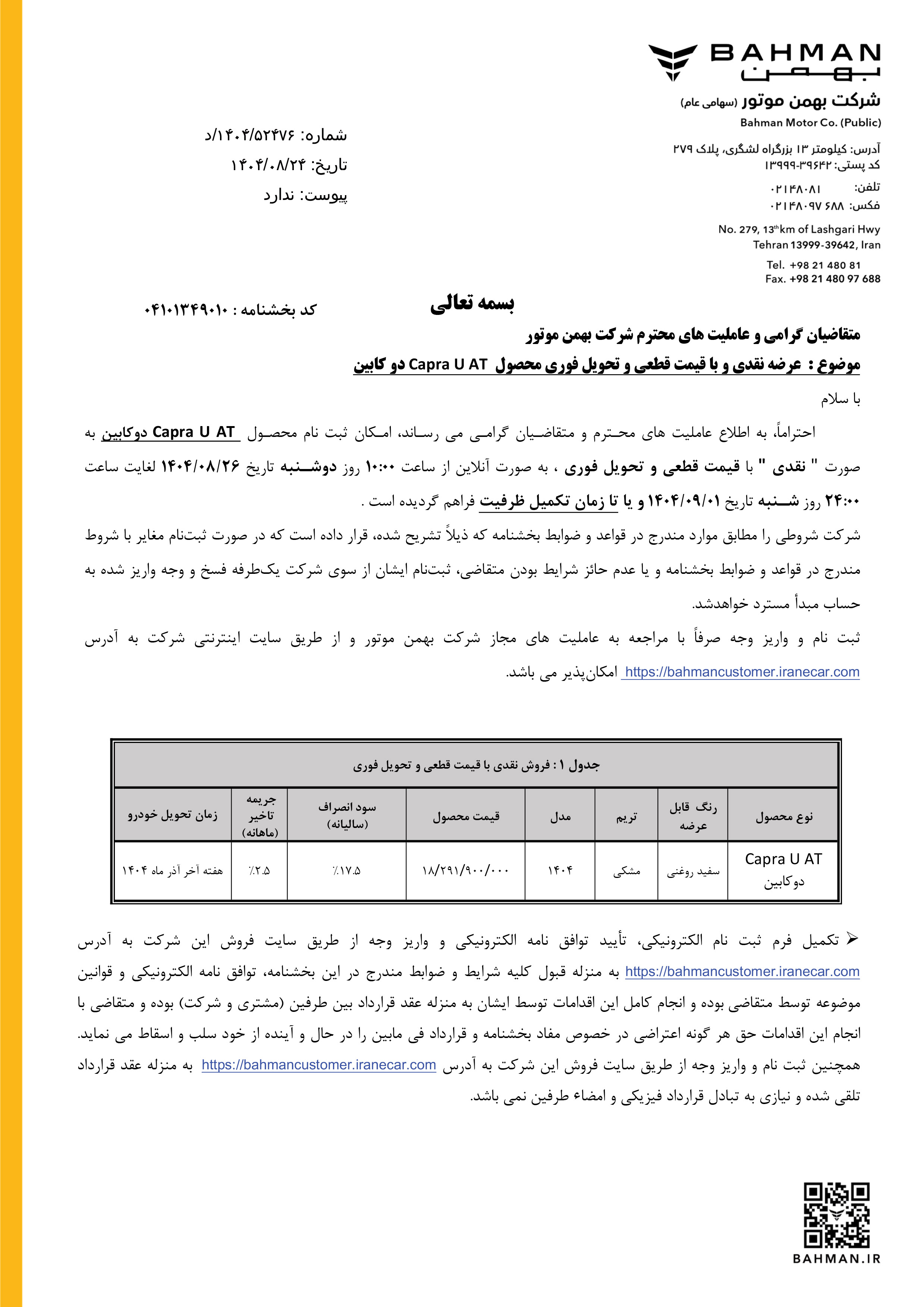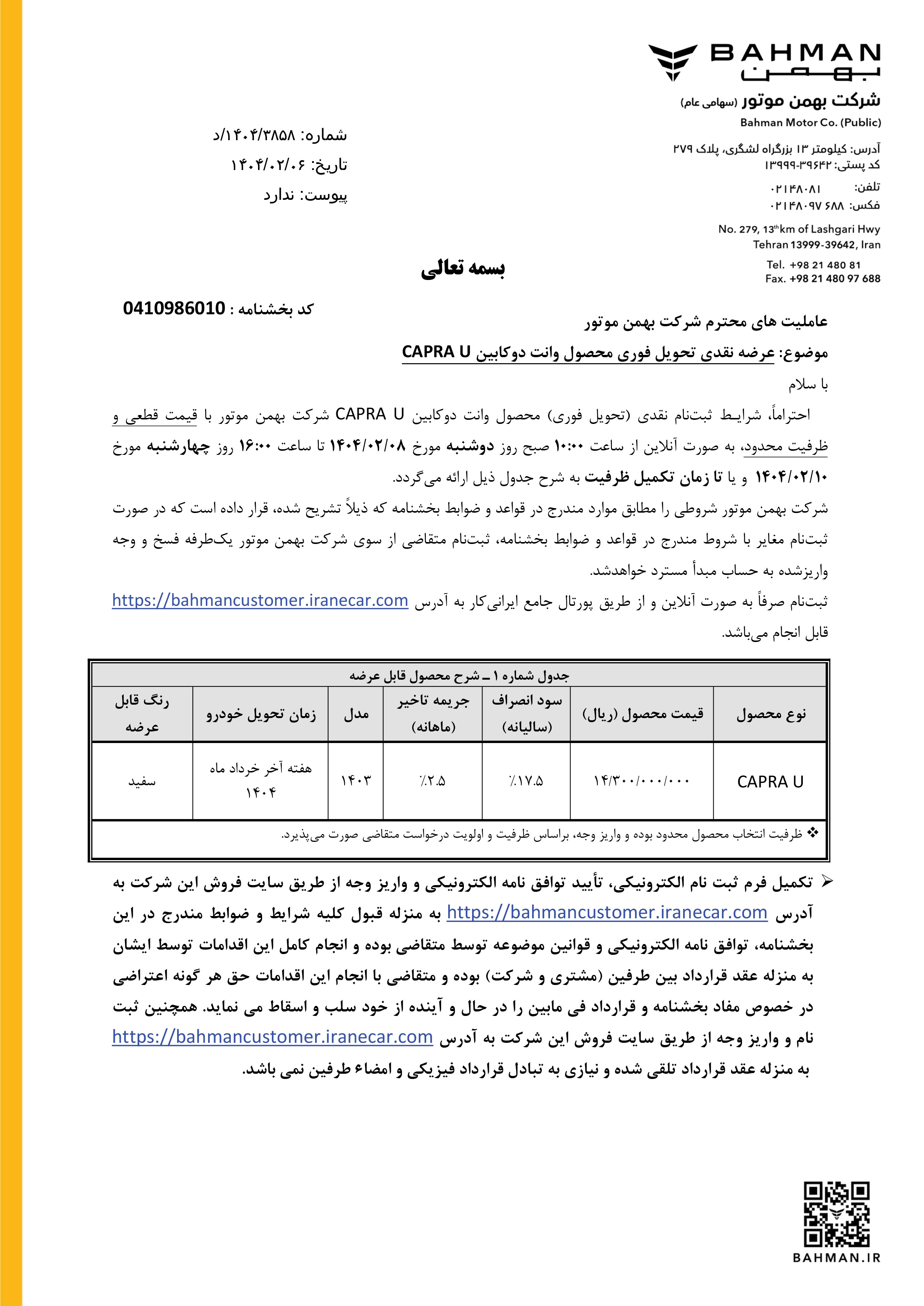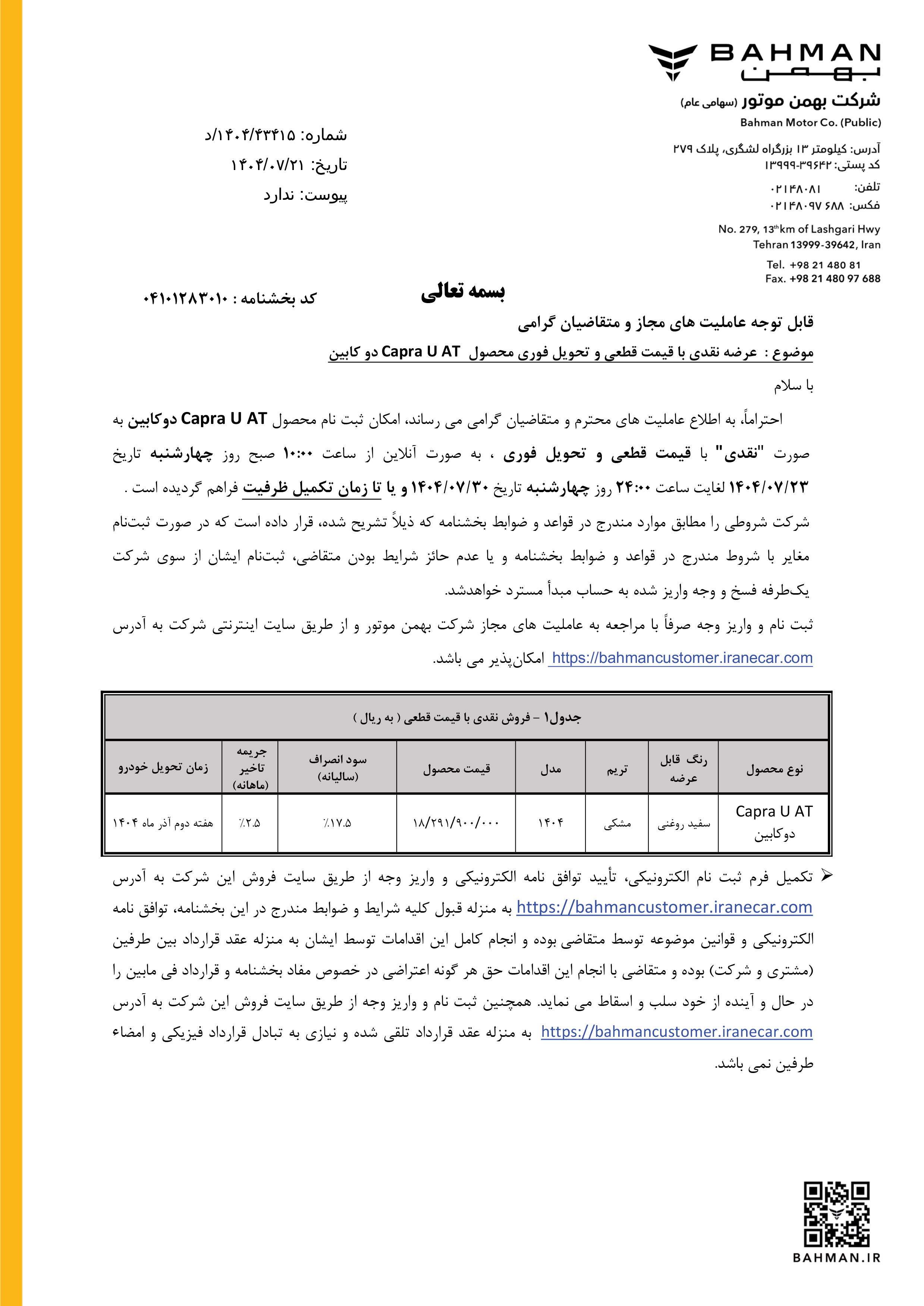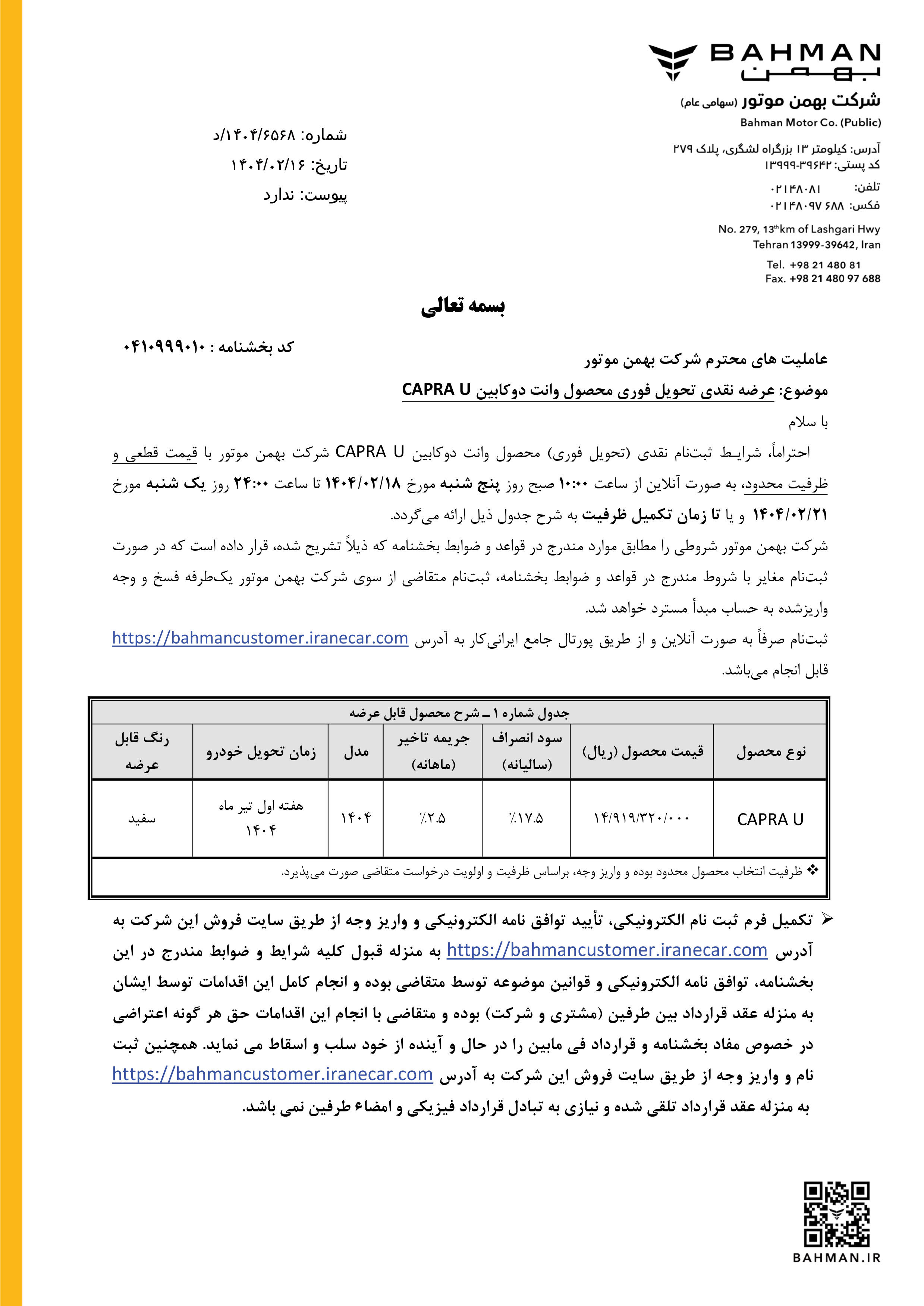 شرایط فروش کاپرا U برای متقاضیان ثبت نام کاپرا یو اتوماتیک، از ساعت 10 صبح روز چهارشنبه مورخ 1404/07/23 از طریق سامانه فروش اینترنتی شرکت بهمن، آغاز میشود: