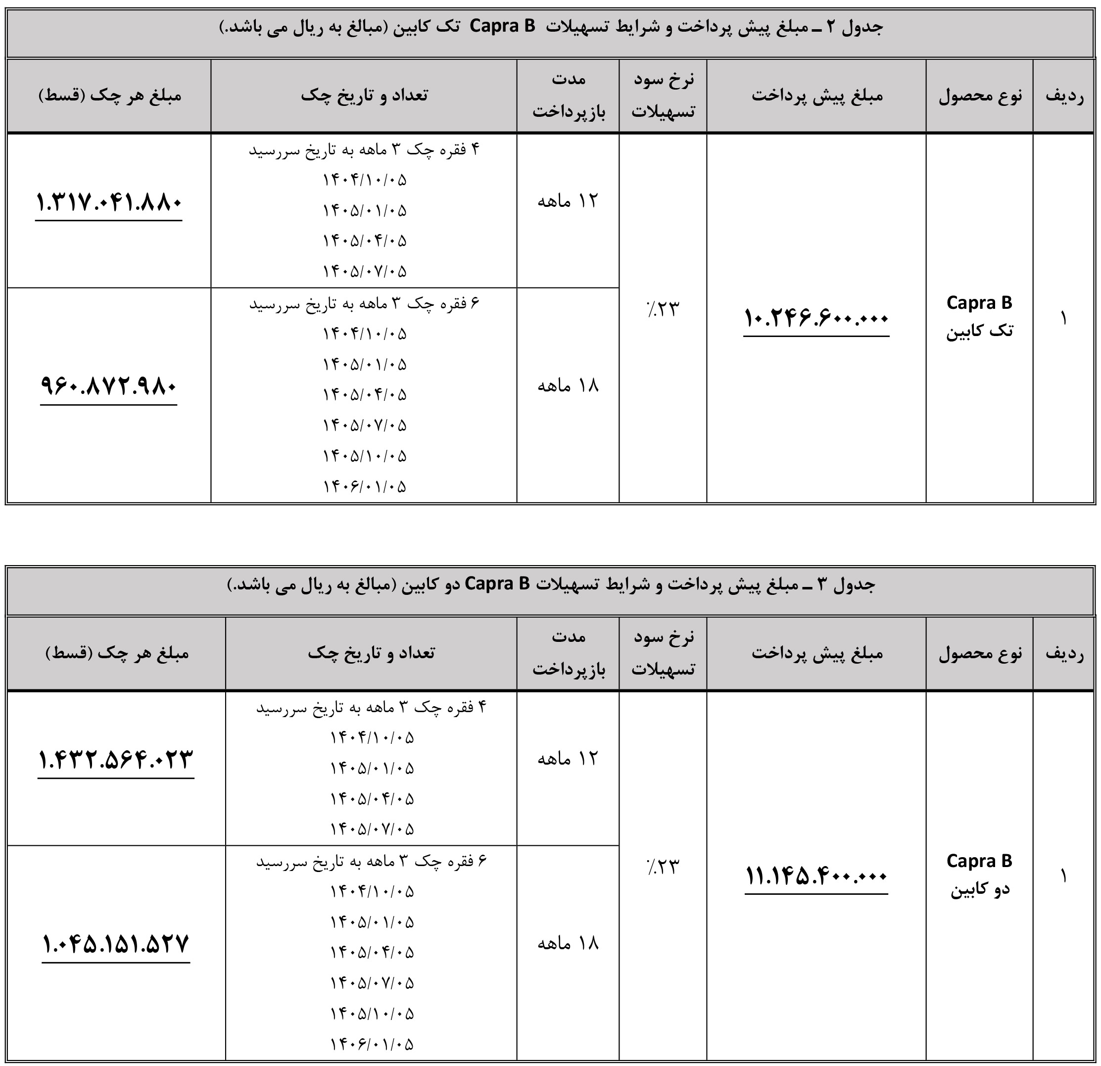 در این مرحله از فروش کاپرا B، مشتریان میتوانند طرح فروش اقساطی کاپرا را نیز با بازپرداخت 12 ماهه یا 18 ماهه و نرخ سود 23 درصد انتخاب نمایند. جزییات بیشتر را از لینک زیر دریافت کنید: