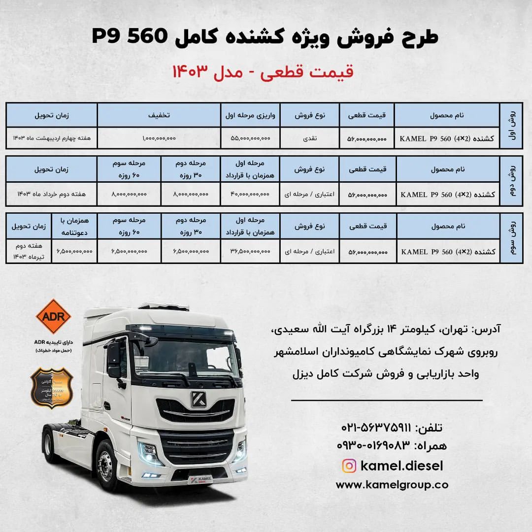 براساس بخشنامه فروش کشنده کامل دیزل، قیمت خودروها قطعی بوده و موعد تحویل انها نیز برای بهار و تابستان 1403 است. جزییات بیشتر را از لینک زیر دریافت کنید: