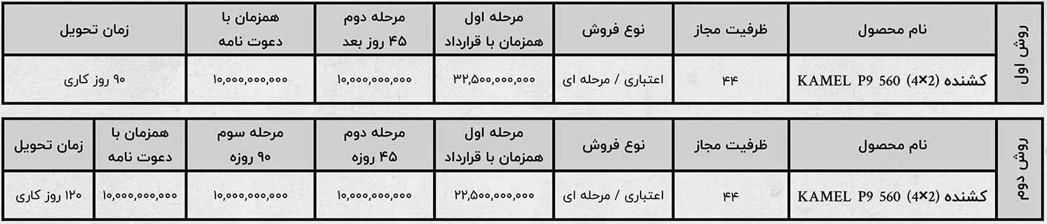 شرایط ثبت نام کامل دیزل ویژه اردیبهشتماه 1403 اعلام شد. در این مرحله از پیش فروش کامل دیزل، متقاضیان میتوانند کشنده P9 را با قیمت غیرقطعی و مطابق جدول زیر خریداری نمایند: