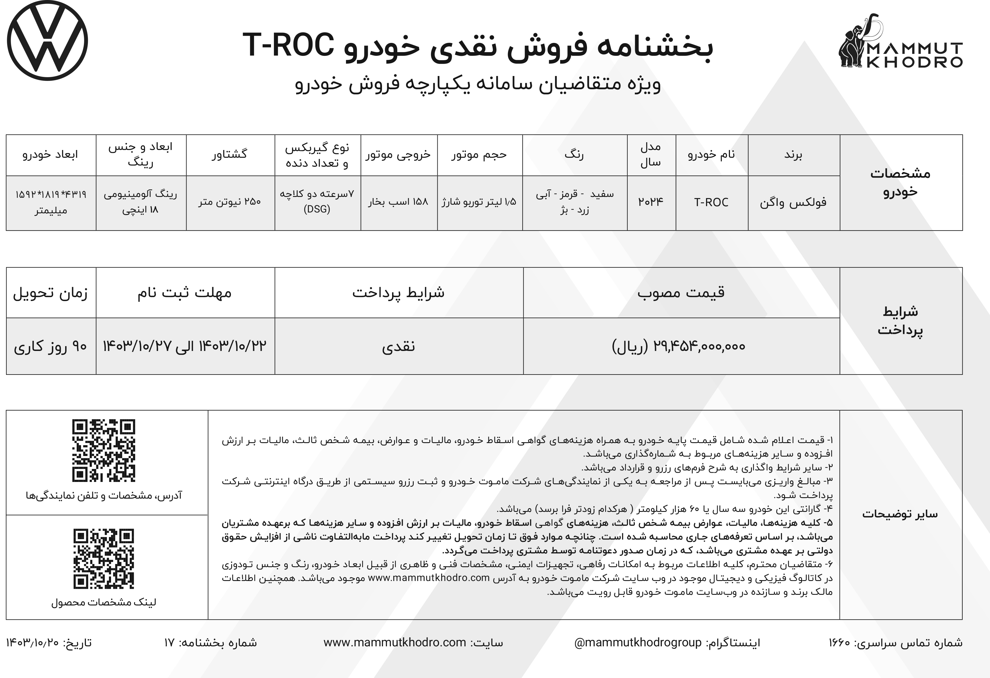 ثبت نام ماموت خودرو، ویژه منتخبین سامانه یکپارچه وارداتی که نسبت به انتخاب خودروی VW TROC اقدام کردهاند، برای اولینبار اعلام شده است. برهمین اساس، ثبت نام فولکس ماموت خودرو، از روز شنبه مورخ 1403/10/22 مطابق جدول زیر آغاز میشود: