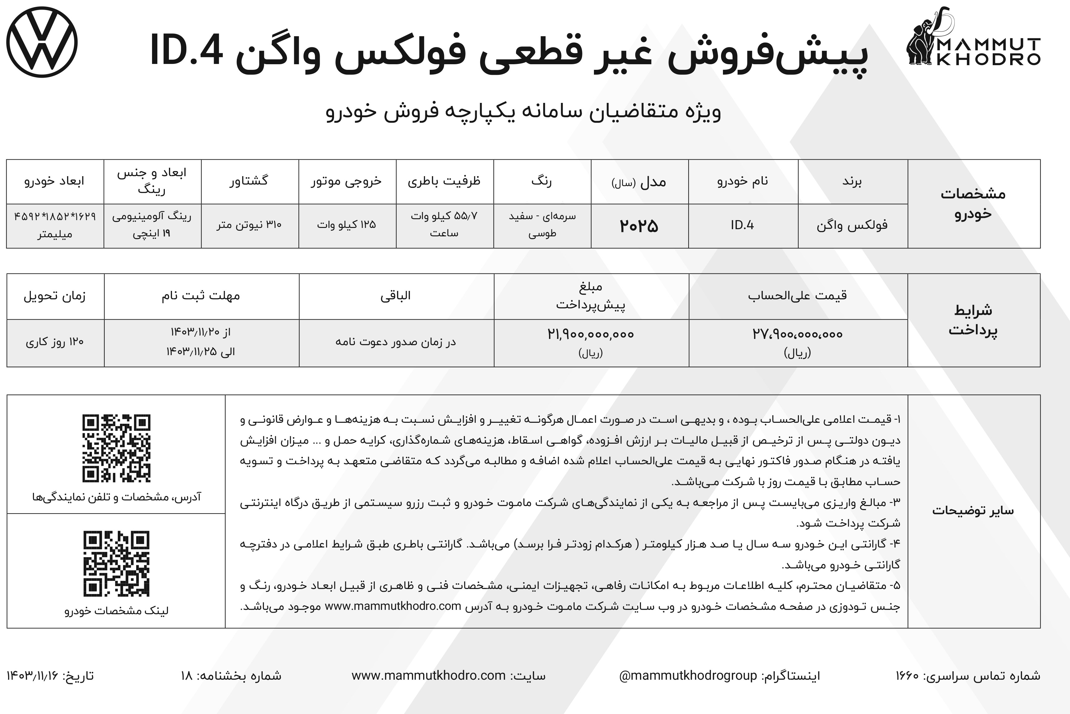 شرایط پیش فروش فولکس واگن ID4 برقی، برای نخستینبار توسط شرکت ماموت خودرو اعلام شد. در این مرحله از ثبت نام ماموت خودرو، صرفا منتخبین سامانه یکپارچه وارداتی، امکان واریز وجه پیش پرداخت و تکمیل مراحل ثبت نام فولکس واگن را دارند: