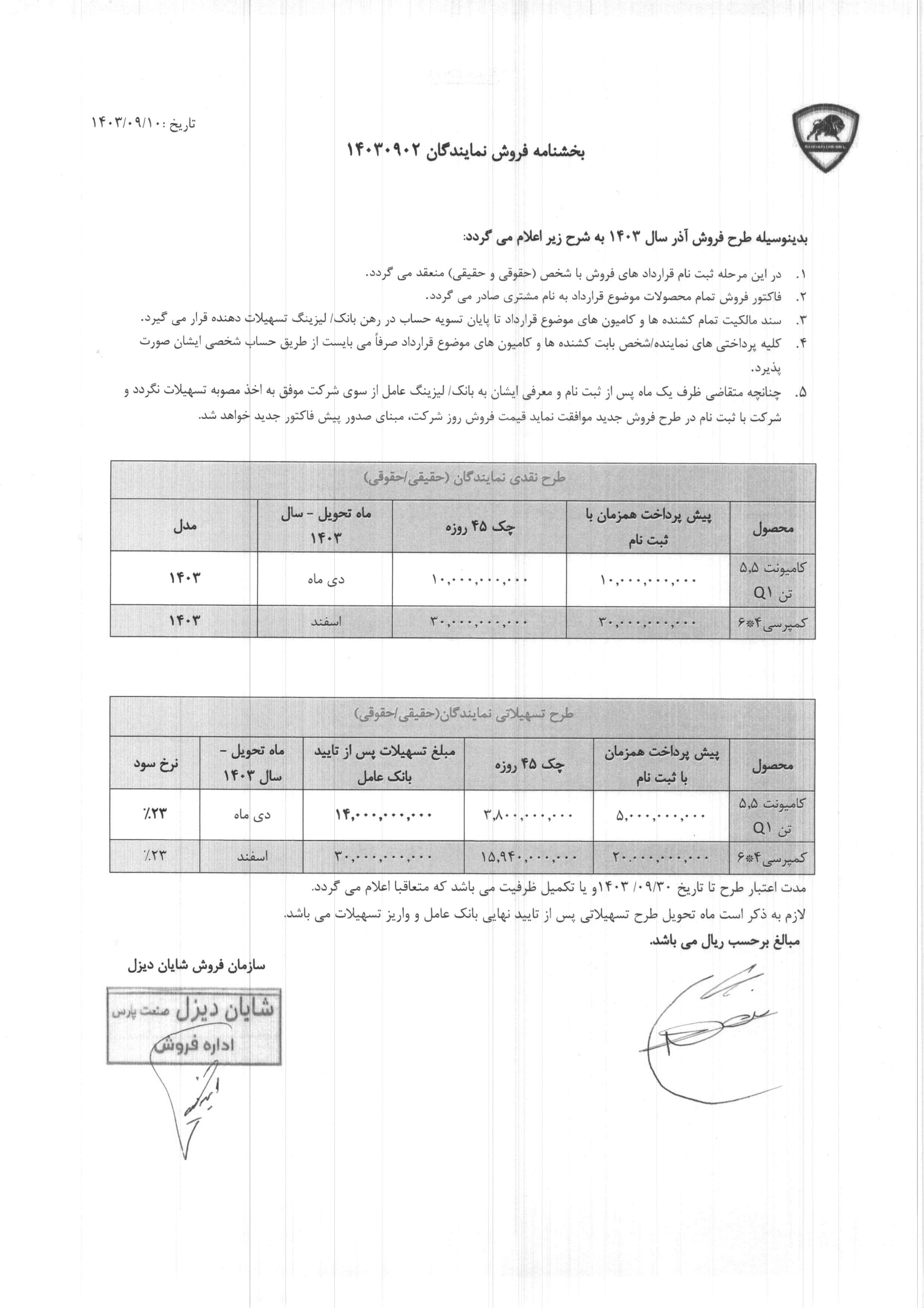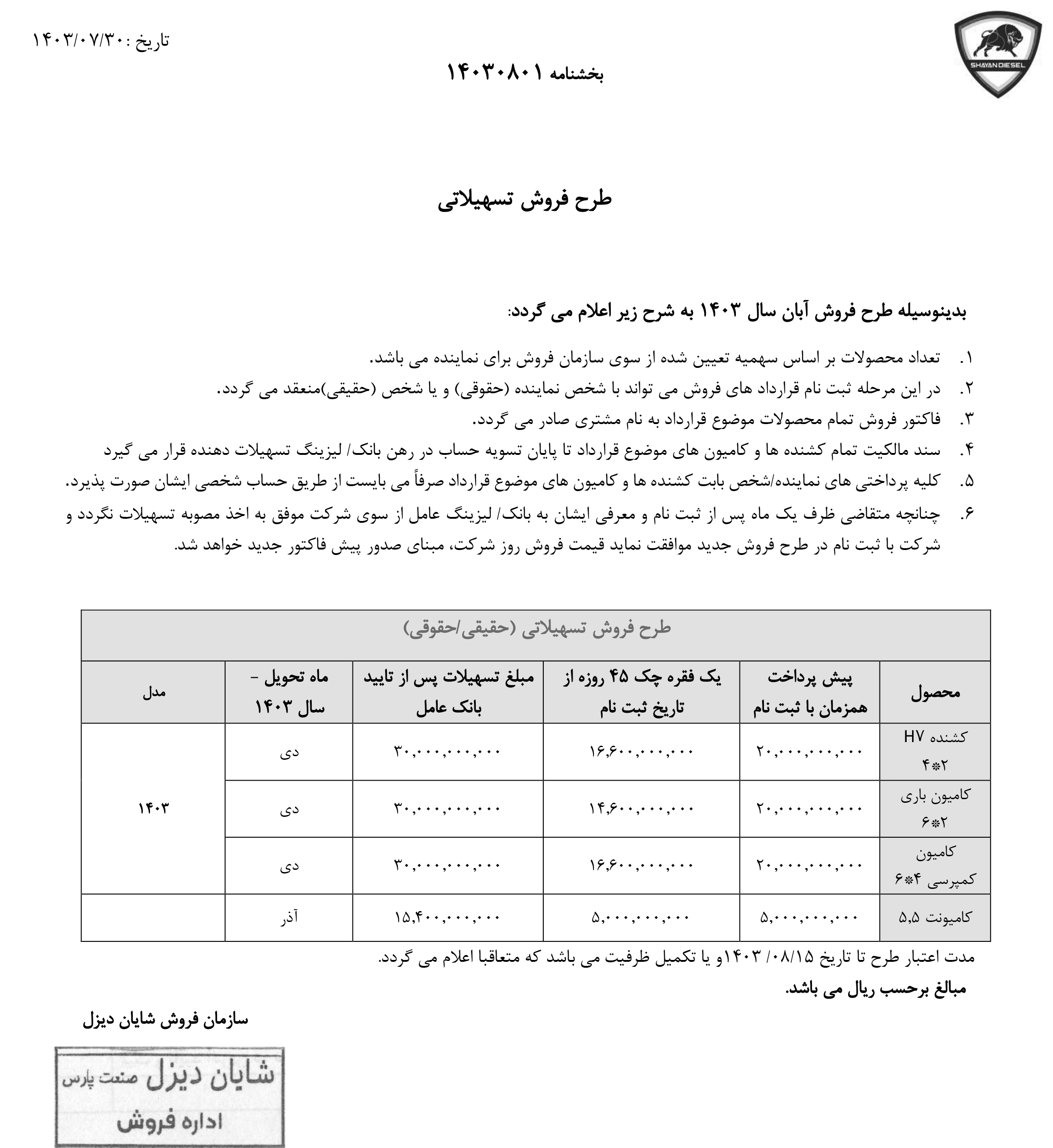 فروش نقدی و اقساطی شایان دیزل: آذر 1403