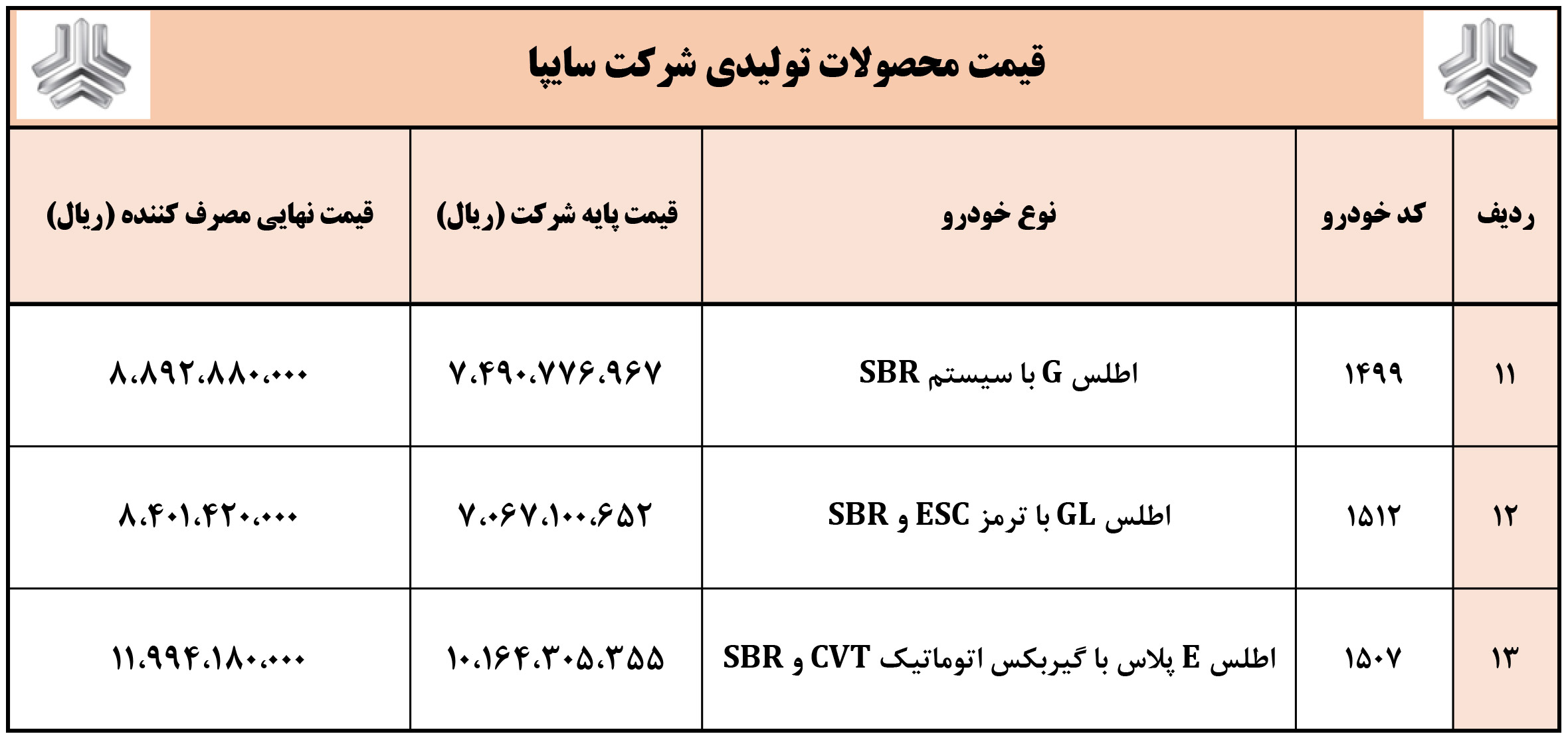 همزمان با شروع آذرماه 1403، شرکت خودروسازی سایپا، قیمت انواع اطلس، شامل تیپهای دستی و اتوماتیک این خودرو را مطابق جدول زیر، اعلام کرده است: