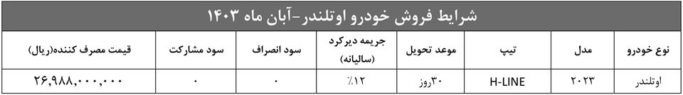 دومین مرحله فراخوان ثبت نام اولتندر 2023، از سوی شرکت آرین موتور اعلام شد. در این مرحله از فروش اوتلندر وارداتی، صرفا منتخبین سامانه یکپارچه وارداتی، مجاز به ثبت نام خودرو هستند. متقاضیان واجد شرایط می‌توانند از روز دوشنبه مورخ 1403/04/11 لغایت روز شنبه مورخ 1403/04/16 نسبت به واریز وجه پیش پرداخت، اقدام نمایند: