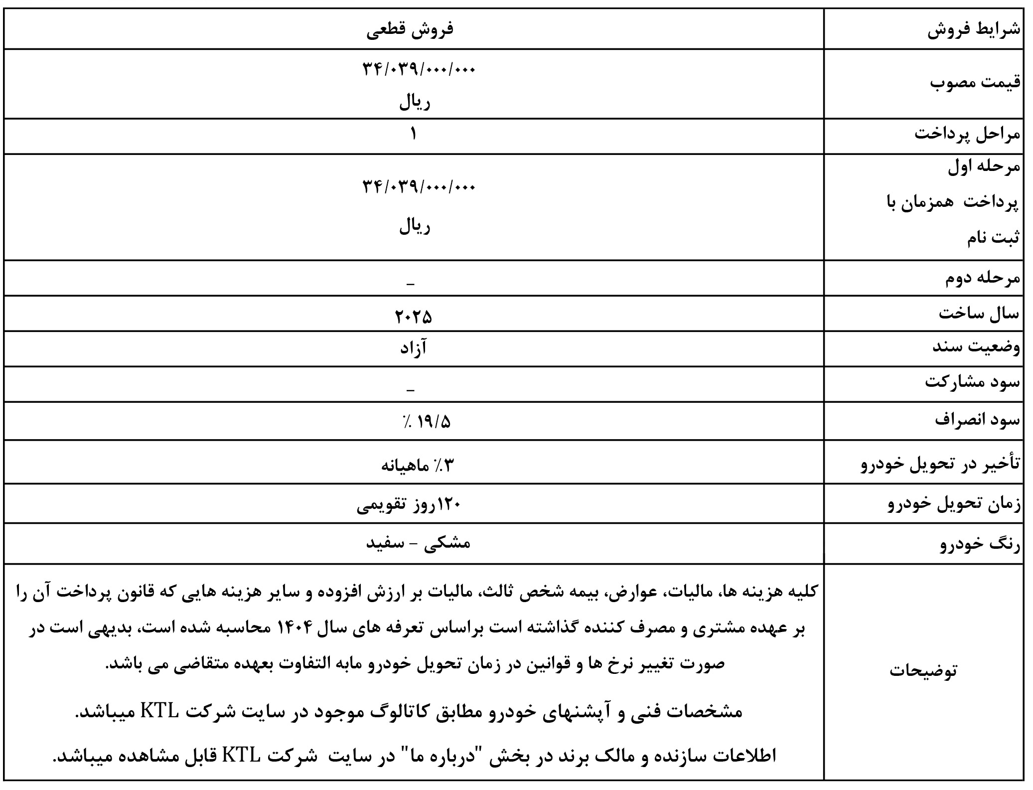 براساس بخشنامه فروش اقساطی کرمان موتور، قیمت خودروها قطعی بوده و تاریخ اولین چک نیز در 1404/09/15 خواهد بود. جزییات بیشتر را از لینک زیر دریافت کنید: