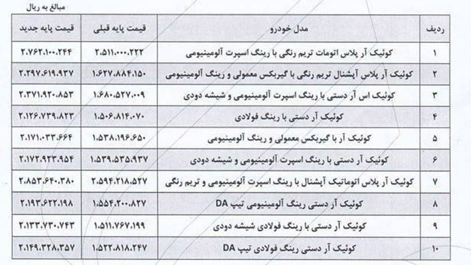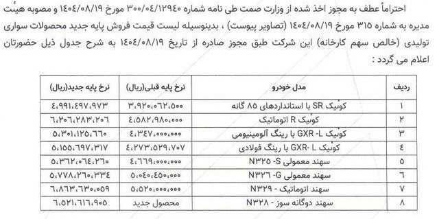 مدل قیمت پایه قدیم قیمت پایه جدید درصد افزایش