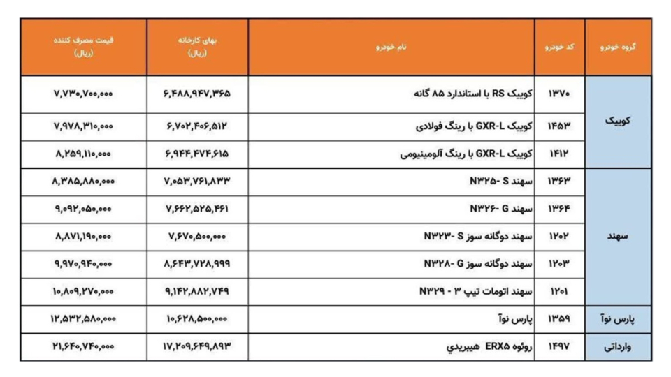 گفتنی است هزینه‌های فوق، قیمت خام کارخانه بوده و سایر هزینه‌های جانبی، مانند بیمه، عوارض، مالیات و ... در آنها لحاظ نشده است.