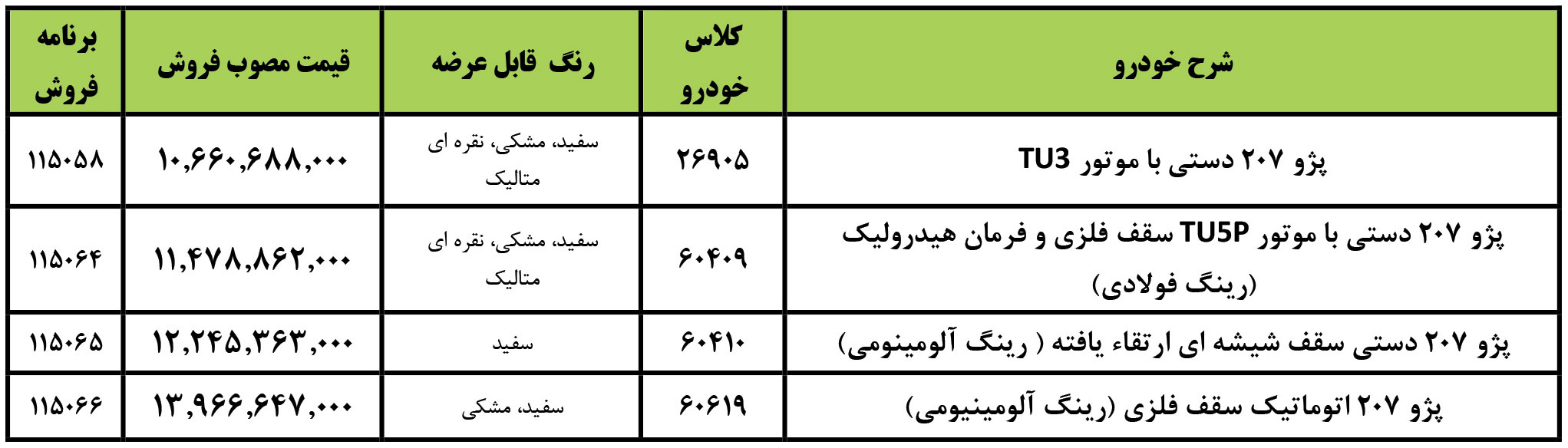 همزمان با اعلام مرحله یازدهم فروش ایران خودرو ویژه آذرماه 1404، شرایط ثبت نام پژو 207 نیز مشخص شده است. برهمین اساس، متقاضیان خرید خودروهای 207 با موتور TU3 و TU5P، از روز دوشنبه مورخ 1404/09/24 تا پایان روز شنبه مورخ 29 آذرماه 1404 جهت انتخاب یکی از محصولات خانواده 207 (مطابق جدول زیر) از طریق سامانه ikcosales.ir مهلت خواهند داشت: