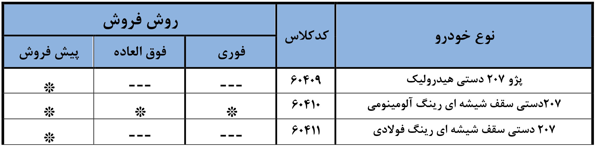 همزمان با اعلام هشتمین مرحله فروش سراسری شرکت ایران خودرو ویژه مهرماه 1404، شرایط فروش انواع محصولات پژو 207 نیز از سوی این شرکت اعلام شده است که براساس آن، متقاضیان از روز یکشنبه مورخ 1404/07/06 تا پایان روز پنجشنبه مورخ 1404/07/10 جهت نام‌نویسی و انتخاب حداکثر یک خودرو، مهلت دارند: