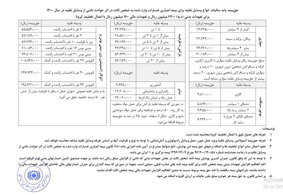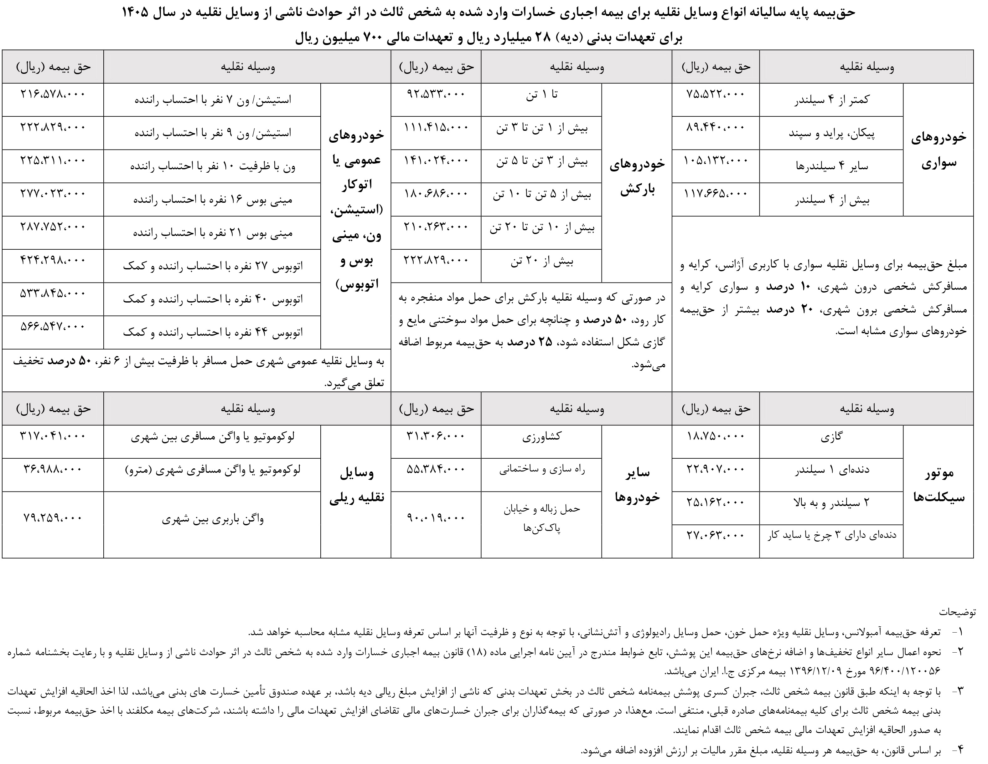 فروردین 1403: براساس بخشنامه ابلاغی بیمه مرکزی برای سال 1403 نرخ جدید بیمه شخص ثالث انواع وسایل نقلیه موتوری، مطابق جدول زیر اعلام شده است: