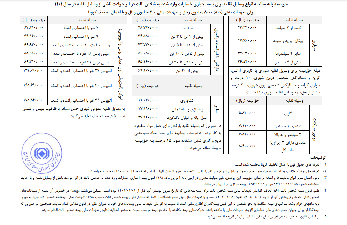 فروردین 1401: با اعلام بیمه مرکزی در تاریخ 8 فروردینماه و پس از تعیین نرخ جدید دیه، قیمت جدید بیمه شخص ثالث برای انواع وسایل نقلیه نیز مشخص شده است: