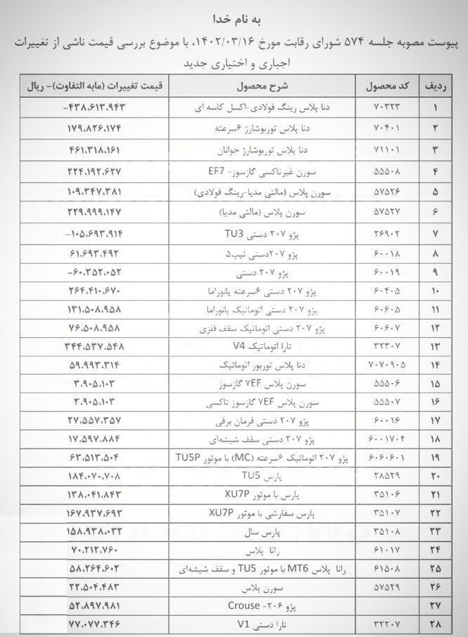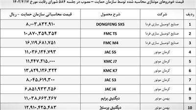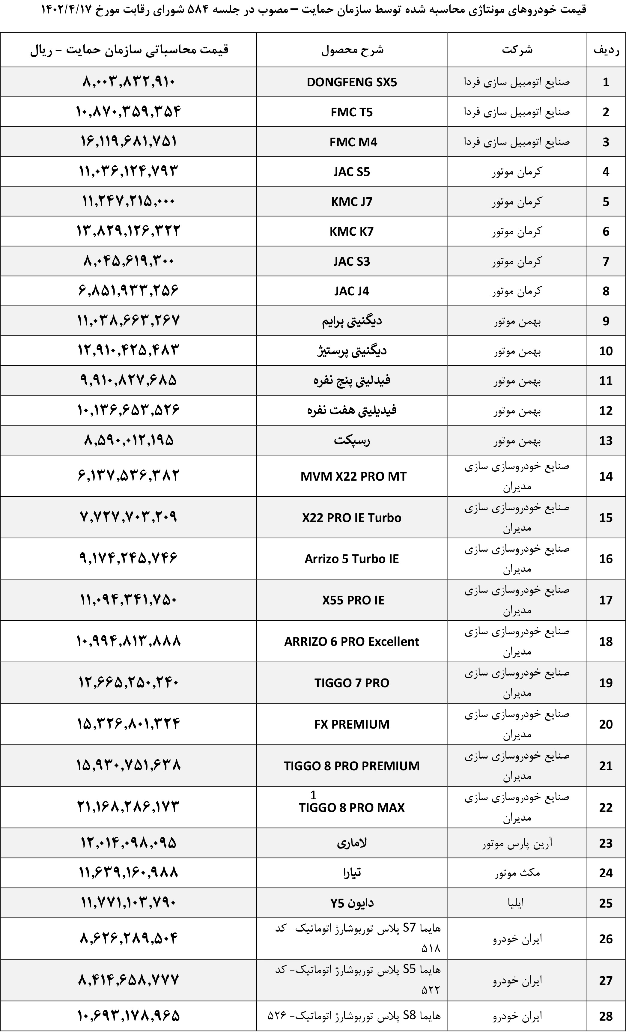 آبان 1402: شورای رقابت در جلسه 615، قیمت سه خودرو مونتاژی را تصویب کرد. این قیمتها، قیمت محاسباتی کارخانه است.