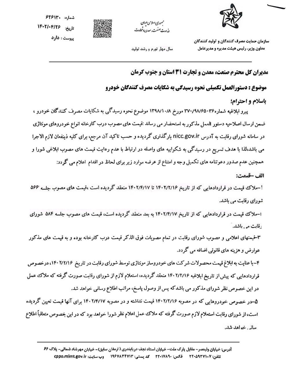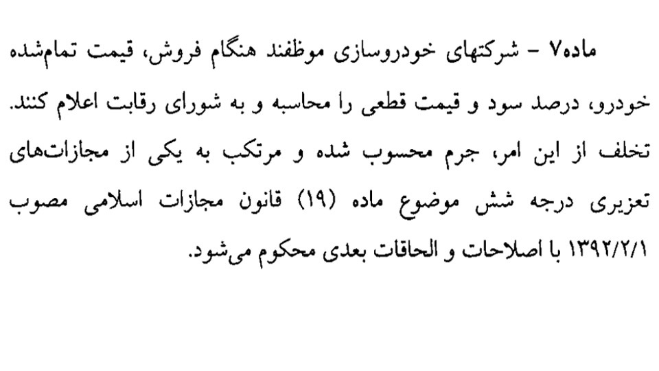 3- افزایش قیمتها برای تمامی خودروهای مشمول دستورالعمل قیمتگذاری شورای رقابت، تا پایان شهریور 1400 اعمال و اجرا میشود.