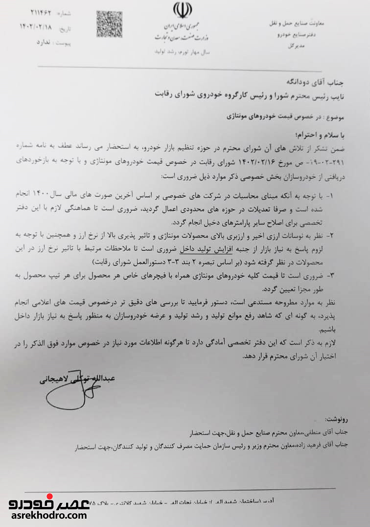 اما براساس مصوبه شواری رقابت، این مجوز بهروزرسانی قیمت محصولات خودروسازان بر اساس فرآیندی طبیعی و طبق چارچوب مصوبه شورای رقابت در خصوص قیمتگذاری محصولات خودروسازان صورت گرفته است.