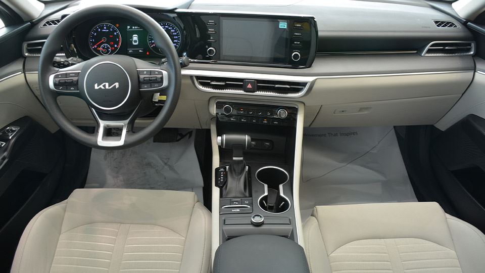 فضای داخلی کیا K5 نیز همچون بدنه آن طراحی اسپرت دارد. مواردی همچون سردنده با طرح جدید که بنابر اعلام کیا از اهرمهای هواپیما الهام گرفته، نمایشگر اطلاعات سرگرمی، تریم متالیک قطعات و قطعاتی با ظاهر شبیه چوب روی داشبورد حس و حالی متفاوت به فضای داخلی این خودرو اعطا کردهاند.
