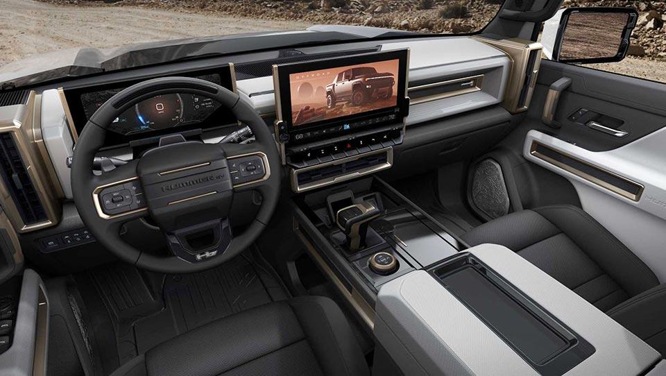 داخل کابین هماهنگی خوبی با موقعیت ممتاز این پیکاپ میبینیم. هامر برقی اکنون از یک نمایشگر اطلاعات و سرگرمی 13.4 اینچی و یک نمایشگر 12.3 اینچی مربوط به المانهای پشت فرمان بهره میبرد.
