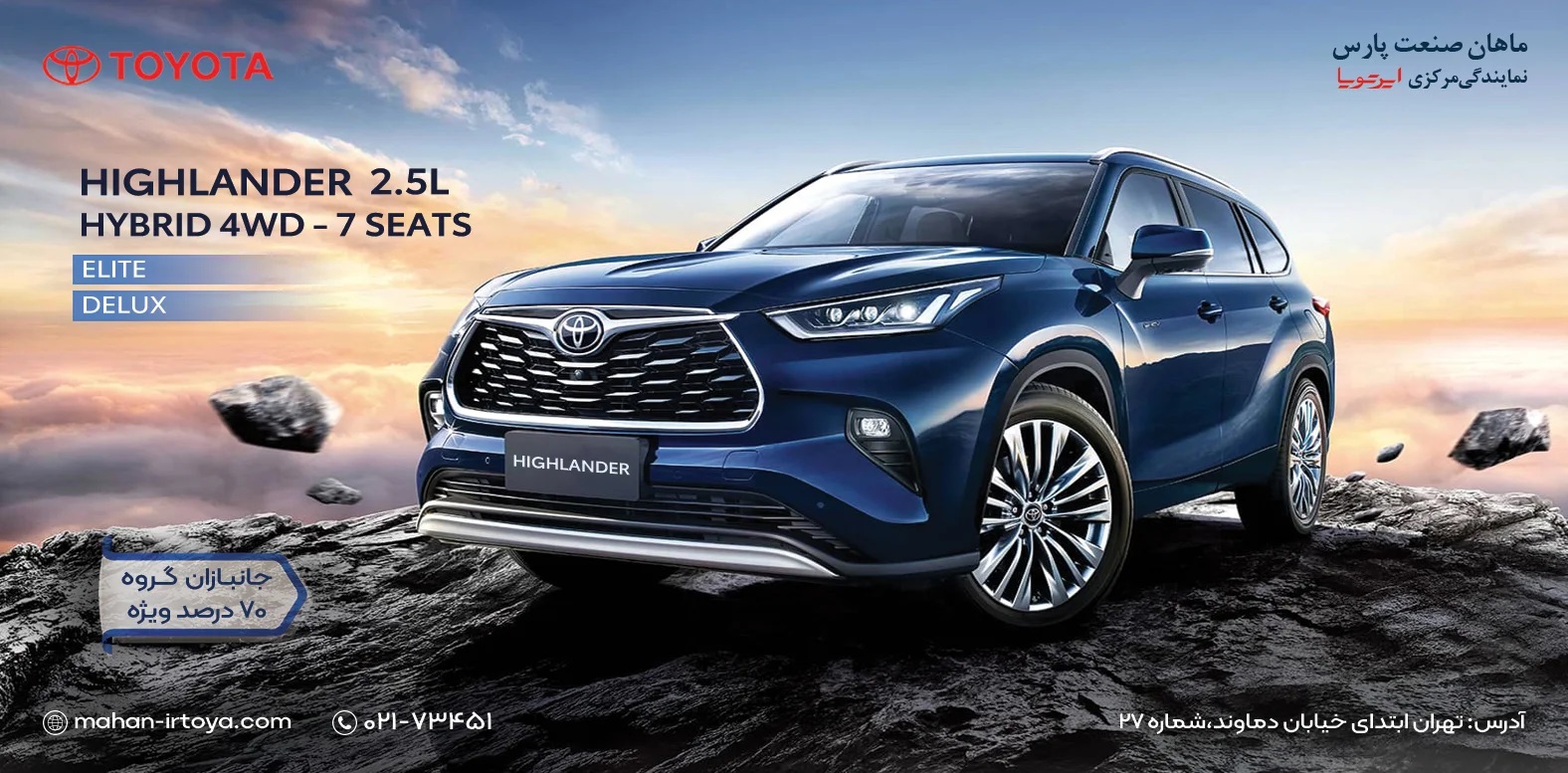 شهریور 1403: شرکت ماهان صنعت پارس، یکی از واردکنندگان محصولات تویوتا در کشورمان است که قصد دارد خودروهای وارداتی خود را در سامانه ثبت نام خودرو جانبازان عرضه کند. یکی از محصولات وارداتی ماهان صنعت پارس، تویوتا هایلندر هیبرید است. این کراساور قرار است در دو تیپ دیلوکس و الیت عرضه شود.