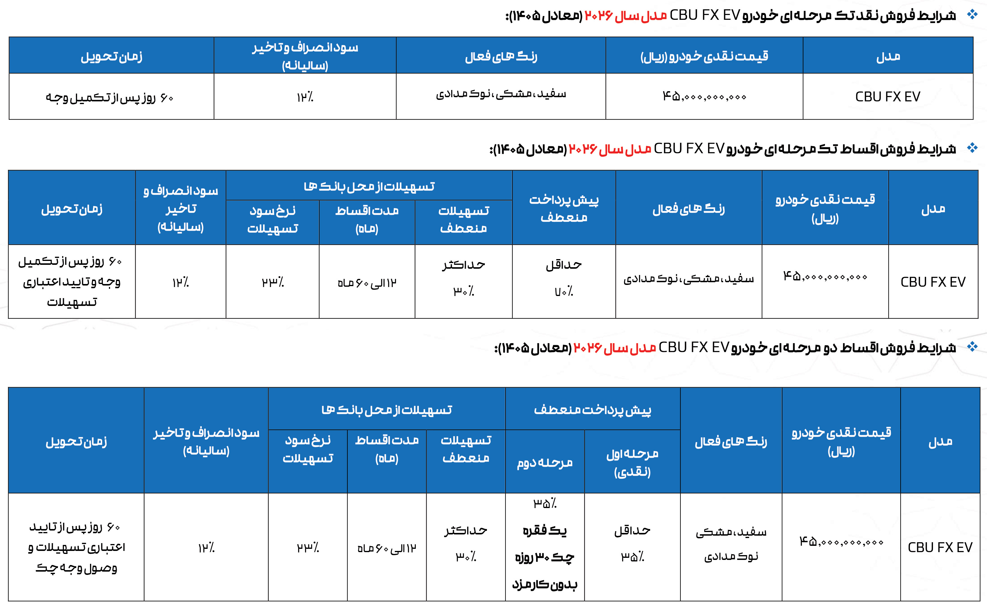 در این مرحله از فروش افایکس برقی، خریداران میتوانند علاوه بر روش نقدی، از روش فروش اقساطی فونیکس با نرخ سود 23% نیز استفاده کنند. جزییات بیشتر را از لینک زیر دریافت کنید:
