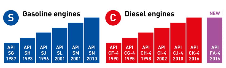 موسسه API سالیانه اقدام به بهروزرسانی دادههای خود میکند و بر این اساس جدول کاملی را تنظیم کرده که بر اساس خودروهای بنزین با حرف اول S و خودروهای دیزلی با حرف اول C تفکیک میشود. این سطحبندی را به زبان ساده میتوانید در جدول زیر مشاهده کنید. انواع روغن موتور خارجی و حتی روغن موتور ایرانی، از این قواعد پیروی میکنند.