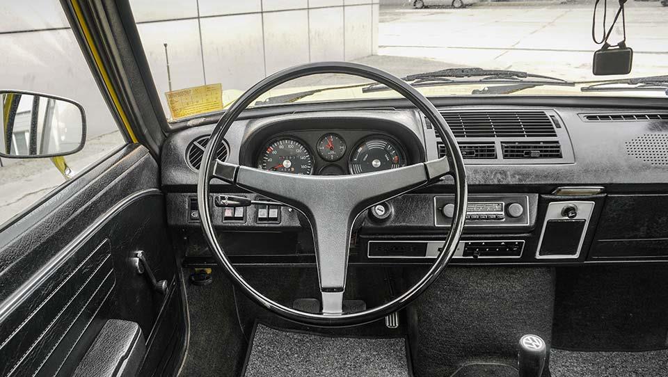 نشانگرهای پشت فرمان چهار دایره را شامل میشوند که دوتای درونی ساعت آنالوگ و در زیر آن لوگو فولکسواگن است، اما دو نشانگر بزرگتر نشاندهنده سرعت لحظهای (سمت چپ) و حجم سوخت درون باک، دمای پیشرانه و چند چراغ ساده هشداردهنده (سمت راست) را در بر میگیرد. عدم وجود آپشنهای رایجی چون شیبهداخ (یا همان سانروف در زبان آلمانی)، نشانگر دور موتور، سیستم تهویه مطبوع یا بالابر برقی شیشهها بلافاصله ذات ارزانقیمت و اقتصادی این خودرو را رو میکند.