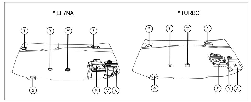 اصلیترین بخشهای درون محفظه موتور دنا EF7 و دنا EF7 توربو را در شکل زیر، مشاهده میکنید: