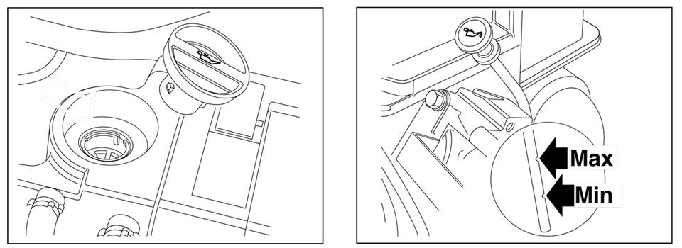 4- برای اضافهکردن روغن، درپوش مخزن را بردارید و روغن را بریزید. دقت داشته باشید که سطح روغن موتور نباید از درجه MAX بیشتر یا از درجه MIN کمتر باشد. حجم دقیق این درجات، عبارتند از: