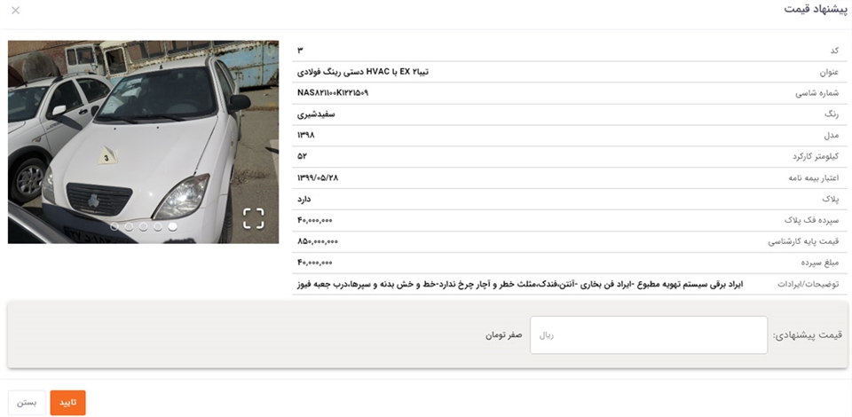 در تصویر فوق، اطلاعات کلی خودروی مزایدهای، یکبار دیگر برای شما نشان داده میشود. نکته اینجاست که قیمت خودرو، در واقع قیمت پایه کارشناسی است و تعیین قیمت نهایی بستگی به مشتریان دارد. در کادر «قیمت پیشنهادی» باید مبلغ موردنظرتان را وارد کنید. همچنین دقت کنید که قیمت شما باید بیشتر از قیمت کارشناسی باشد چراکه در غیر اینصورت، با «پیغام خطا» مواجه میشوید.