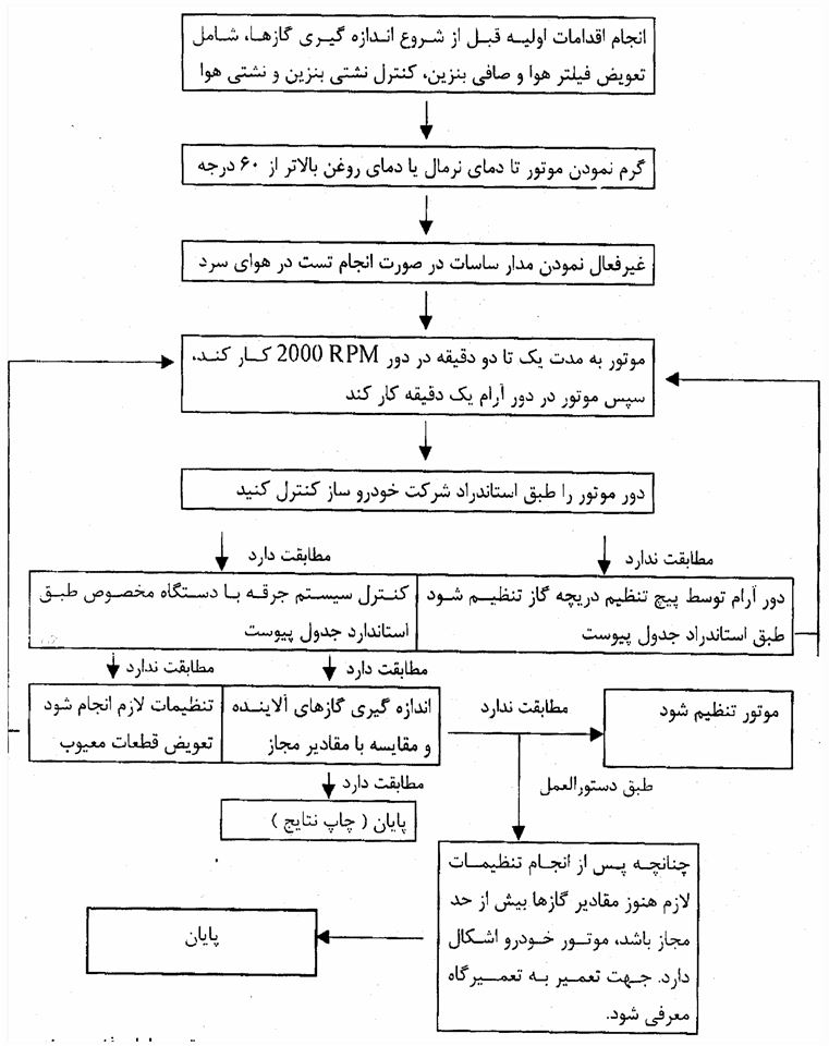 در صورتیكه نتايج حاصل در محدوده مجاز باشند، موتور خـودرو اصطلاحا «تنظـيم است». اما در صورتيكه نتايج حاصل از اندازهگيری گازها توسط دسـتگاه بـا مقـادير مجـاز، مطابقـت نداشته باشد (با بررسی اينكه مقدار كداميك از گازها خارج از محدوده مجاز بوده) باید تنظيم موتور خودرو را انجام دهید. در فلوچارت زیر، مراحل انجام تست گازهای آلاینده خروجی اگزوز را توسط دستگاه آنالیز گازها، مشاهده میکنید.