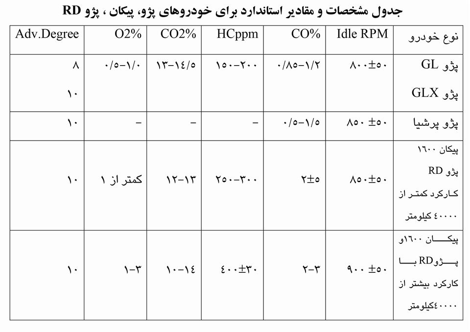 مقادیر مجاز برای تنظیم موتور پیکان و پژو آردی