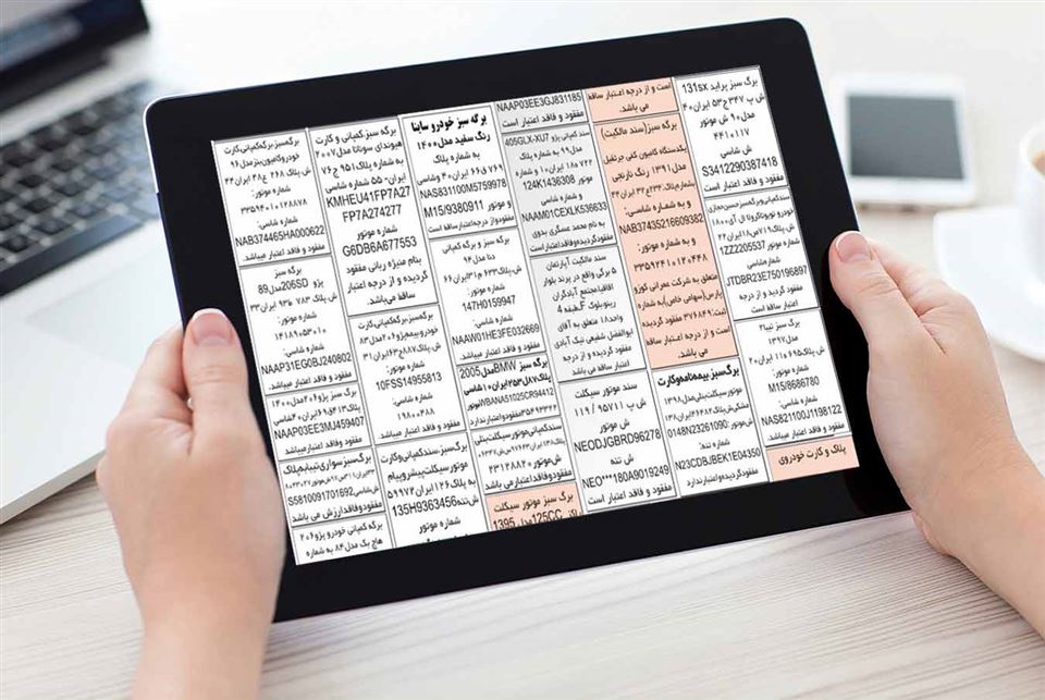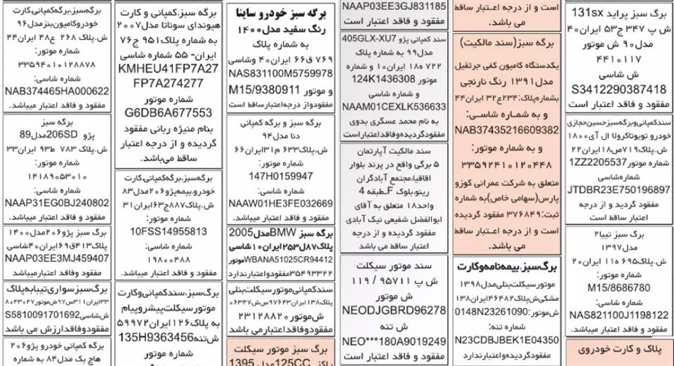 در عبارت فوق، منظور از «مدل»، سال ساخت خودروست. همچنین اطلاعات مربوط به «شماره موتور» و «شماره شاسی» را هم میتوانید از روی برگه سبز ناجا (سند مالکیت وسیله نقلیه) پیدا کنید. در تصویر زیر، چند نمونه آگهی مفقودی کارت خودرو را مشاهده میکنید.