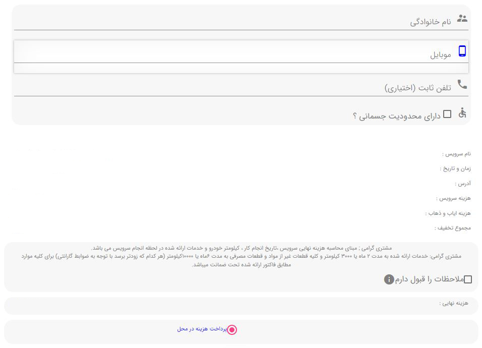 بعد از انتخاب موارد دلخواه، باید روز و ساعت موردنظرتان برای دریافت خدمات سرویس در محل، را نیز انتخاب کنید. در پایان کار، همانند تصویر زیر، باید نام و نام خانوادگی به همراه شماره موبایل (جهت هماهنگی) را وارد کنید. همچنین «هزینه نهایی» نیز در این قسمت، برای شما نشان داده میشود. توجه داشته باشید که هزینه نهایی را باید بعد از اتمام نصب آپشن سایپا، پرداخت کنید.