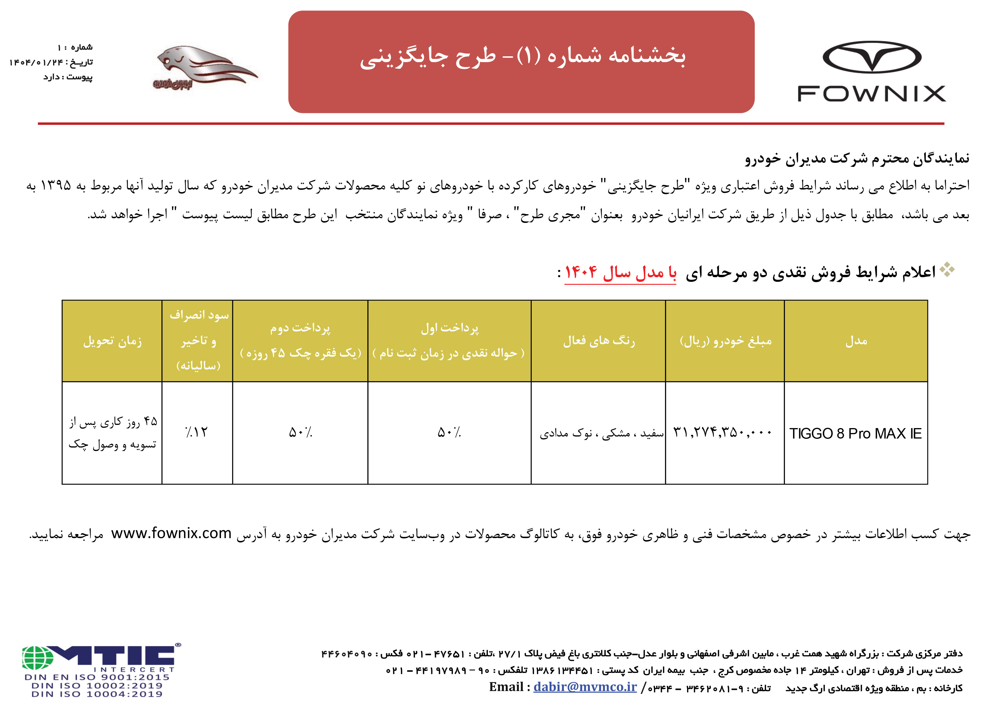 از روز یکشنبه مورخ 1404/01/24 شرایط فروش اعتباری ویژه «طرح جایگزینی مدیران خودرو» توسط شرکت ایرانیان خودرو، مطابق جدول زیر اعلام شده است: