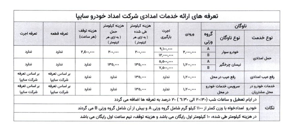 این تعرفهها مربوط به خدمات شرکت امداد خودرو سایپا بوده و شامل نرخ ناوگان امدادی، مبنای محاسبه هزینه حمل خودرو با جرثقیل و خودروبر، ایاب و ذهاب، خدمات امدادی در جادههای بینشهری، خدمات در محل داخل شهر و سایر خدمات مرتبط است.