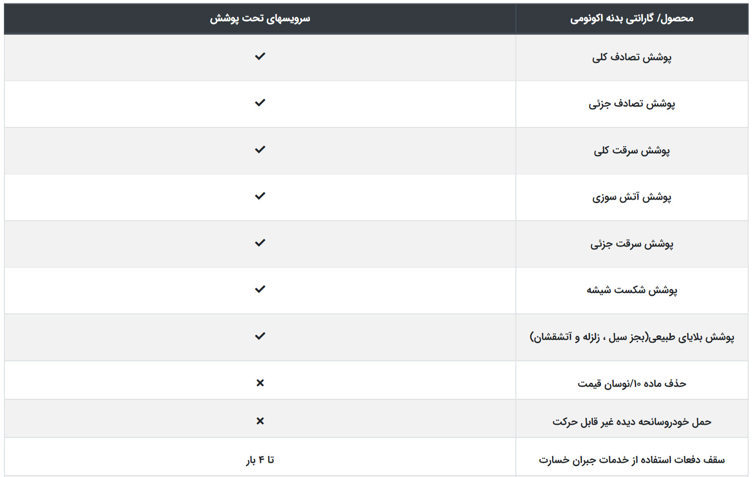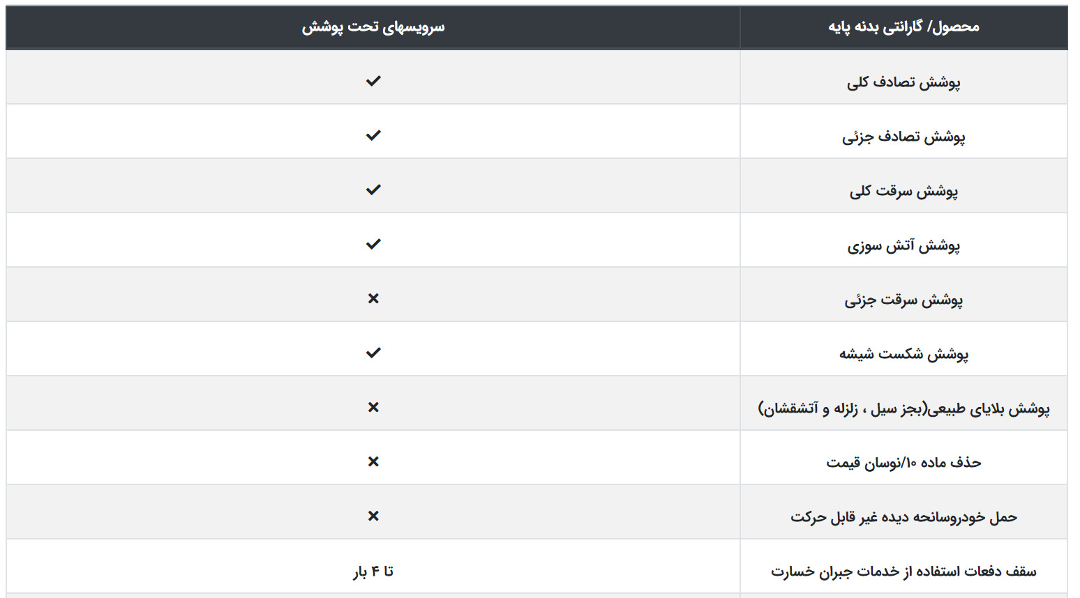 | حداکثر دفعات جبران خسارت | تا 4 بار | تا 4 بار | نامحدود |