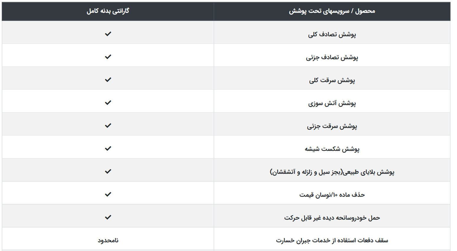 | نوع پوشش | گارانتی پایه | گارانتی اکونومی | گارانتی کامل |