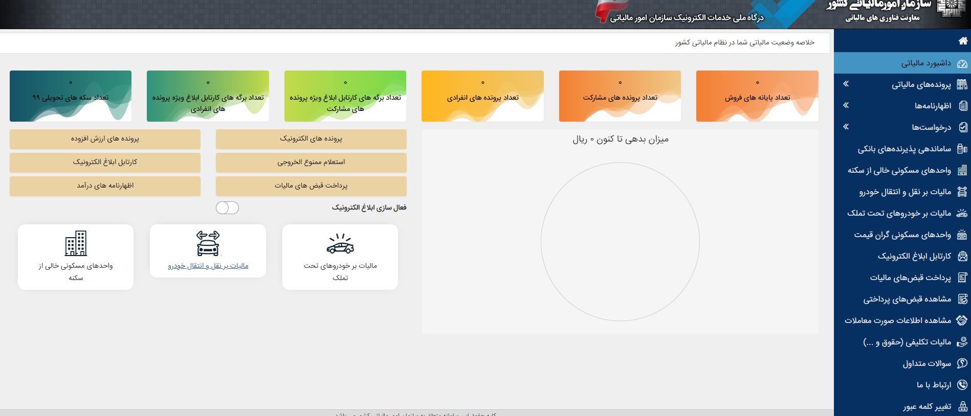 بعد از تایید شماره موبایل، وارد سامانه شده و همانند تصویر زیر، از منوی سمت راست این صفحه، گزینه «مالیات بر نقل و انتقال خودرو» را انتخاب کنید. بعد از کلیک روی این گزینه، خواهید دید که دوباره به سامانه اینترنتی cartransfer.tax.gov.ir منتقل میشوید! و این از عجایب دولت الکترونیک است.