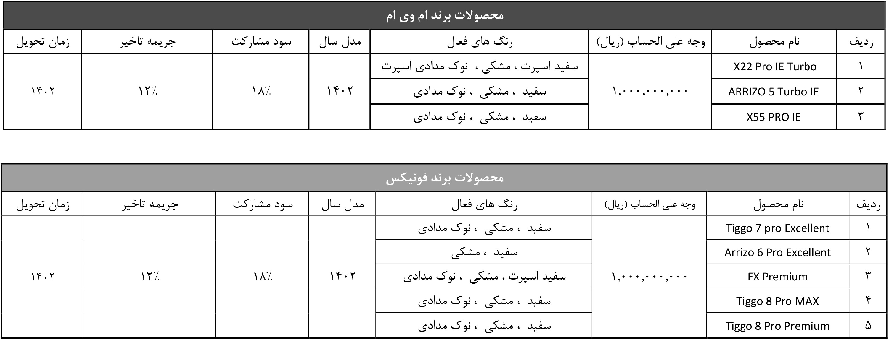 | 3 | مدیران خودرو | فونیکس | تیگو 7 پرو پریمیوم | 1,500,000,000 |